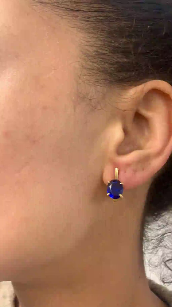 Gold Sapphire Earrings set with a Created Sapphire in a perfect diamond cut, flawless clarity & royal blue color, at 10x8mm each (6 Cts a pair).