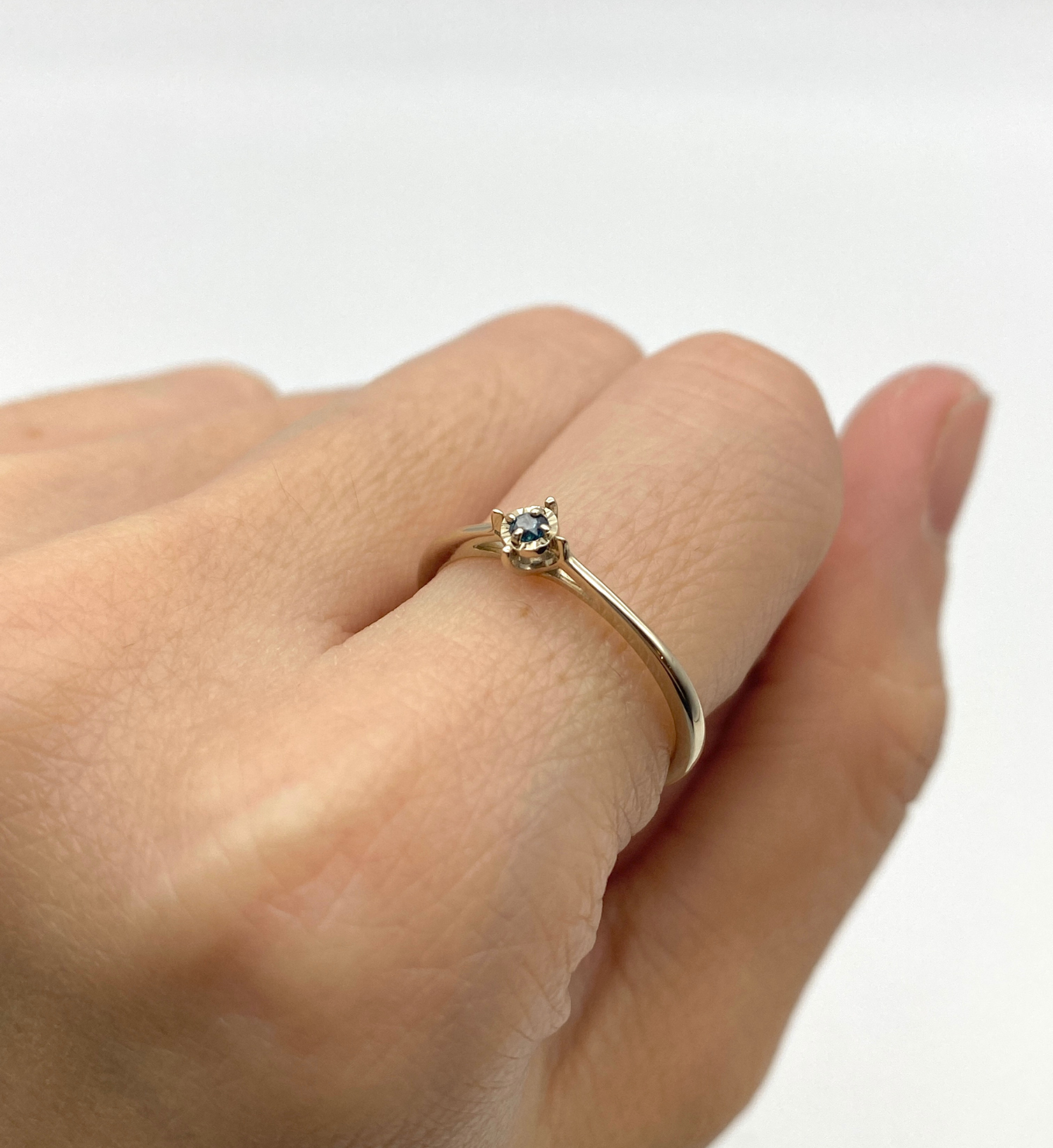 Close-up of created aquamarine ring in 18k gold vermeil, round blue stone in bezel setting