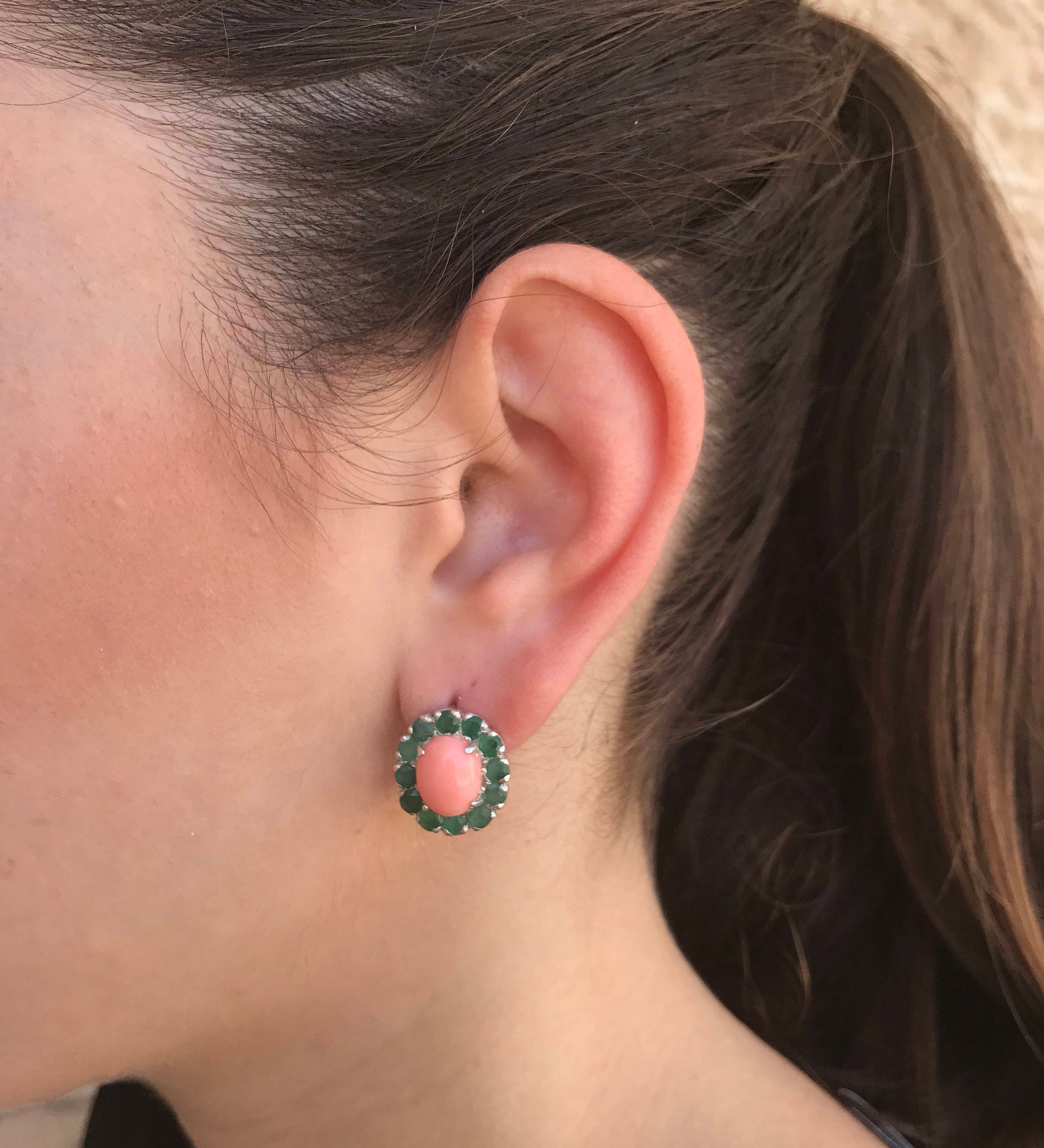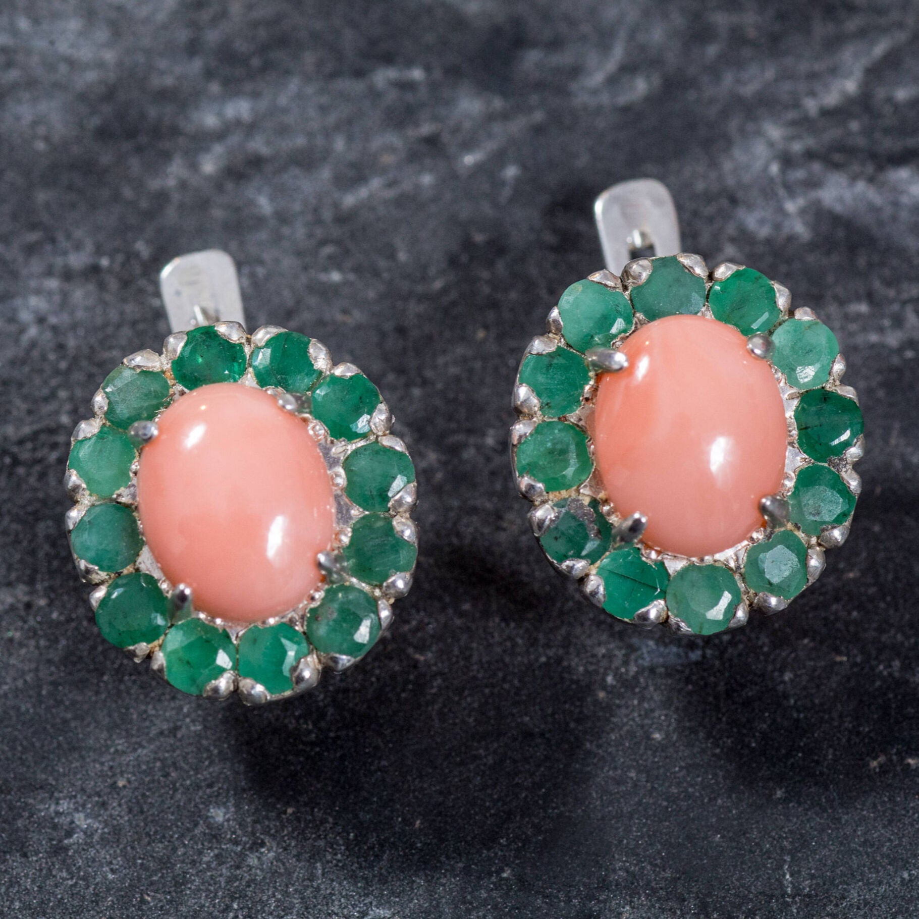 Coral Earrings, Red Coral Earrings, Natural Coral, Long Earrings, Round Earrings, Emerald Earrings, Natural Emerald, May Birthstone, Silver