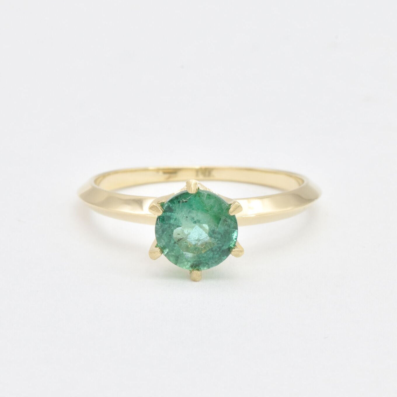 Natural Emerald Ring set in Solid 14k Yellow Gold, in a dainty round cut, and natural green color. May birthstone ring that encourages growth, harmony, and deep emotional healing. Minimalist solid gold ring, perfect for everyday wear, and an ideal may birthday gift idea, or anniversary present.