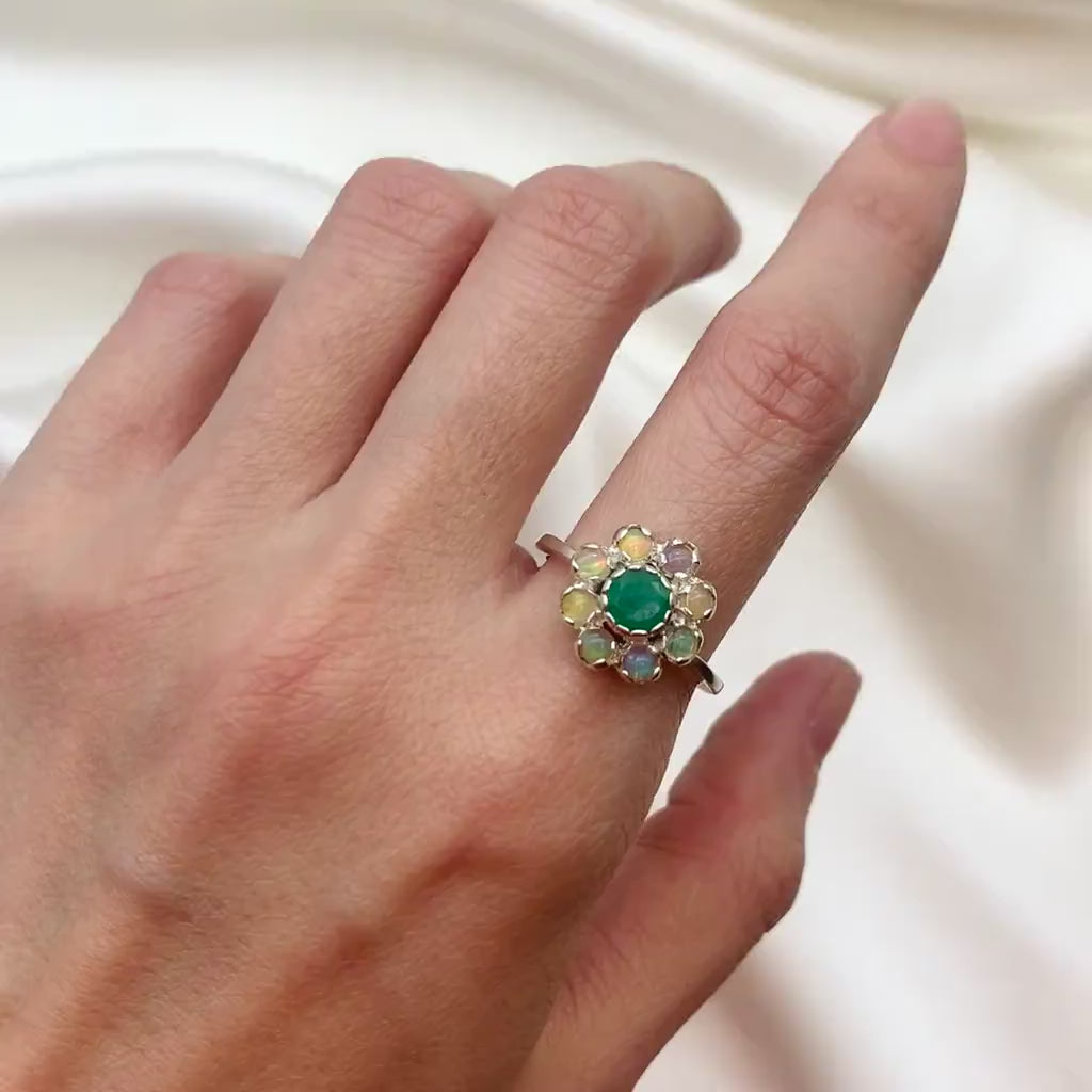 Emerald Flower Ring set with a Natural Emerald in a vivid green color, at size 5mm together with Natural Ethiopian Fire Opal at size 3mm (2 Cts combined).