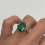 Large Emerald Ring set with Created Emerald in a flawless clarity, perfect diamond cut & vibrant green color, at 14x10mm (6 Cts).