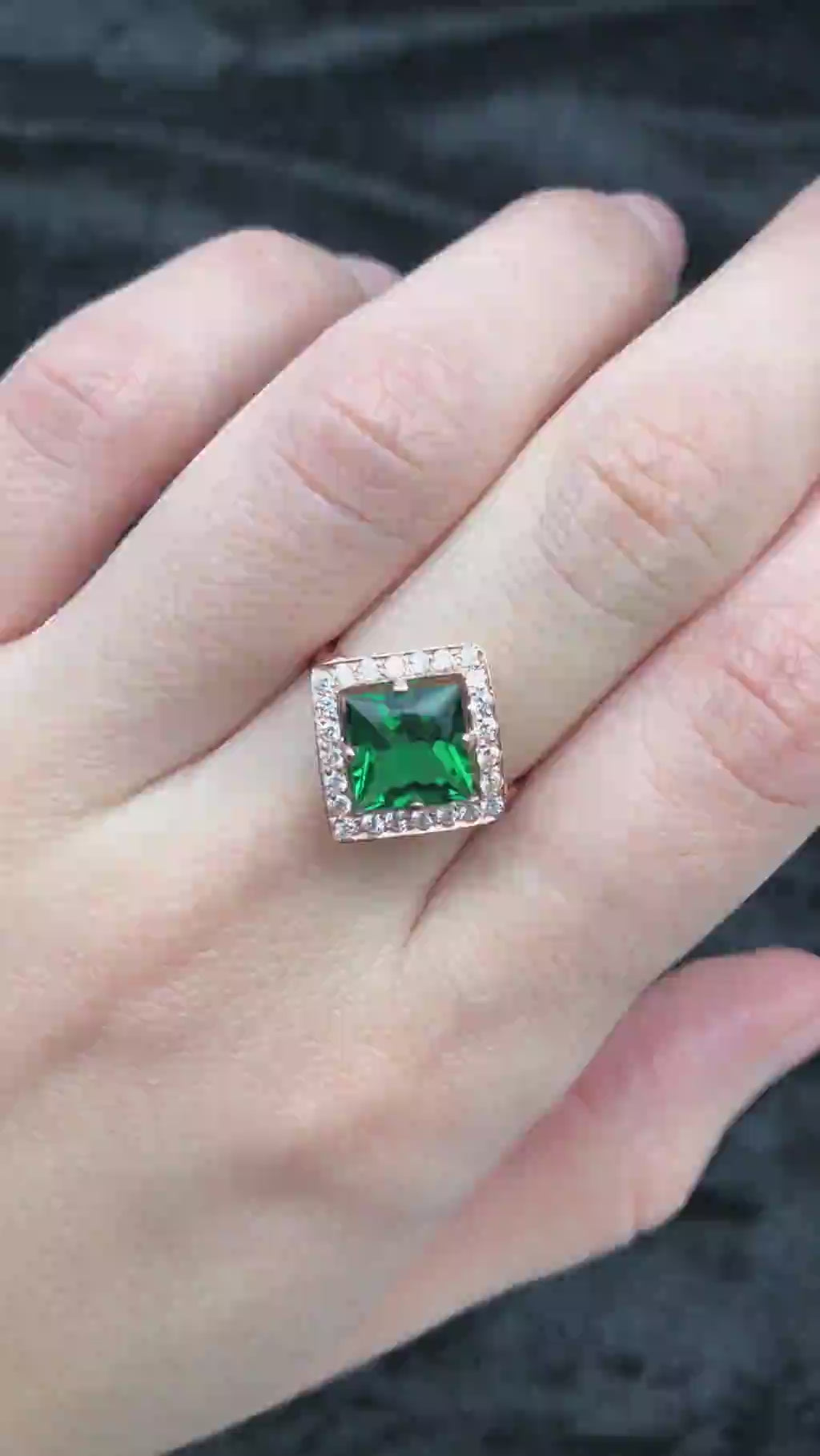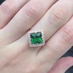 Exquisite Rose Gold Vermeil Ring with Halo setting, showcasing a vibrant Square Created Emerald, perfect for May birthdays and special moments.