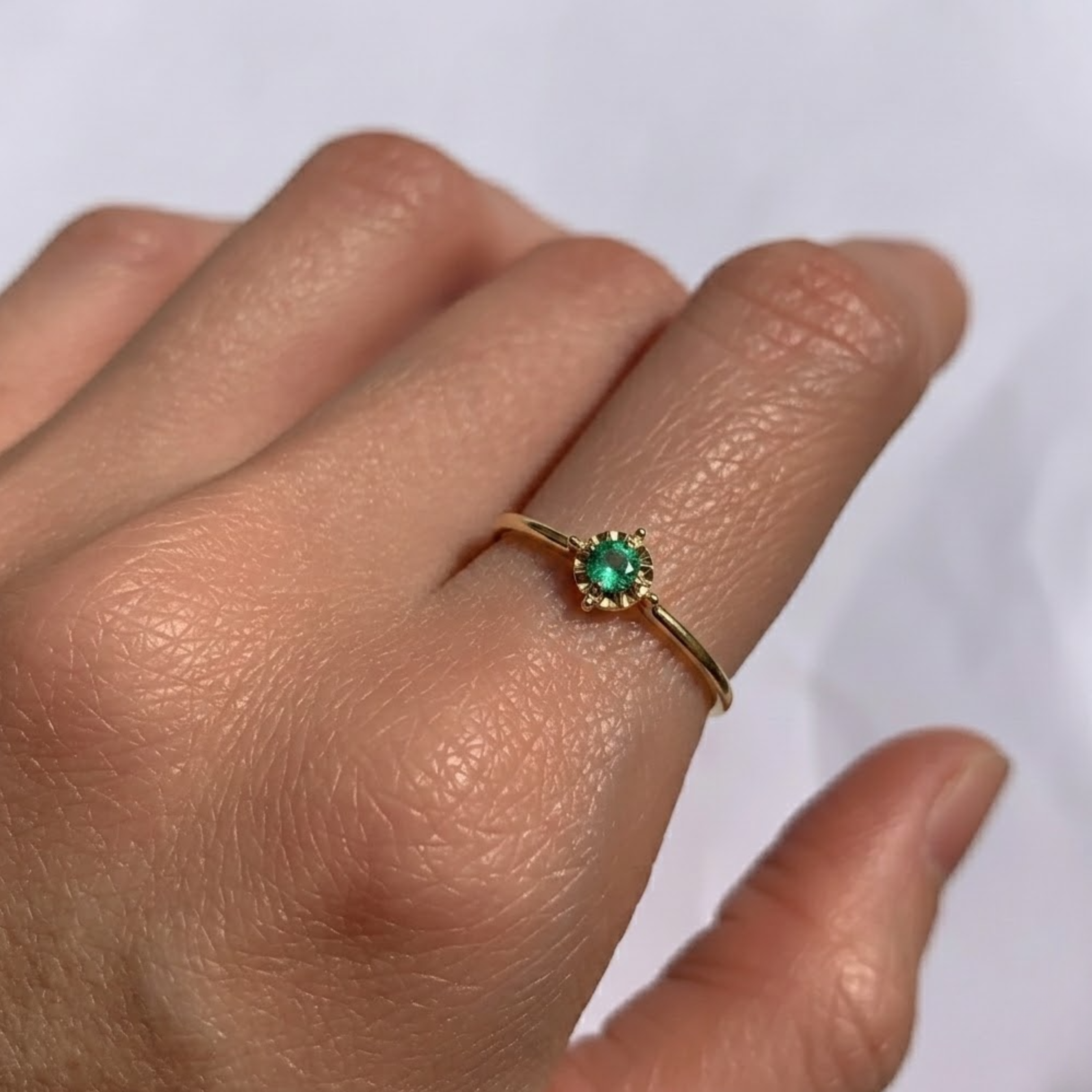 Dainty Emerald Ring worn on ring finger