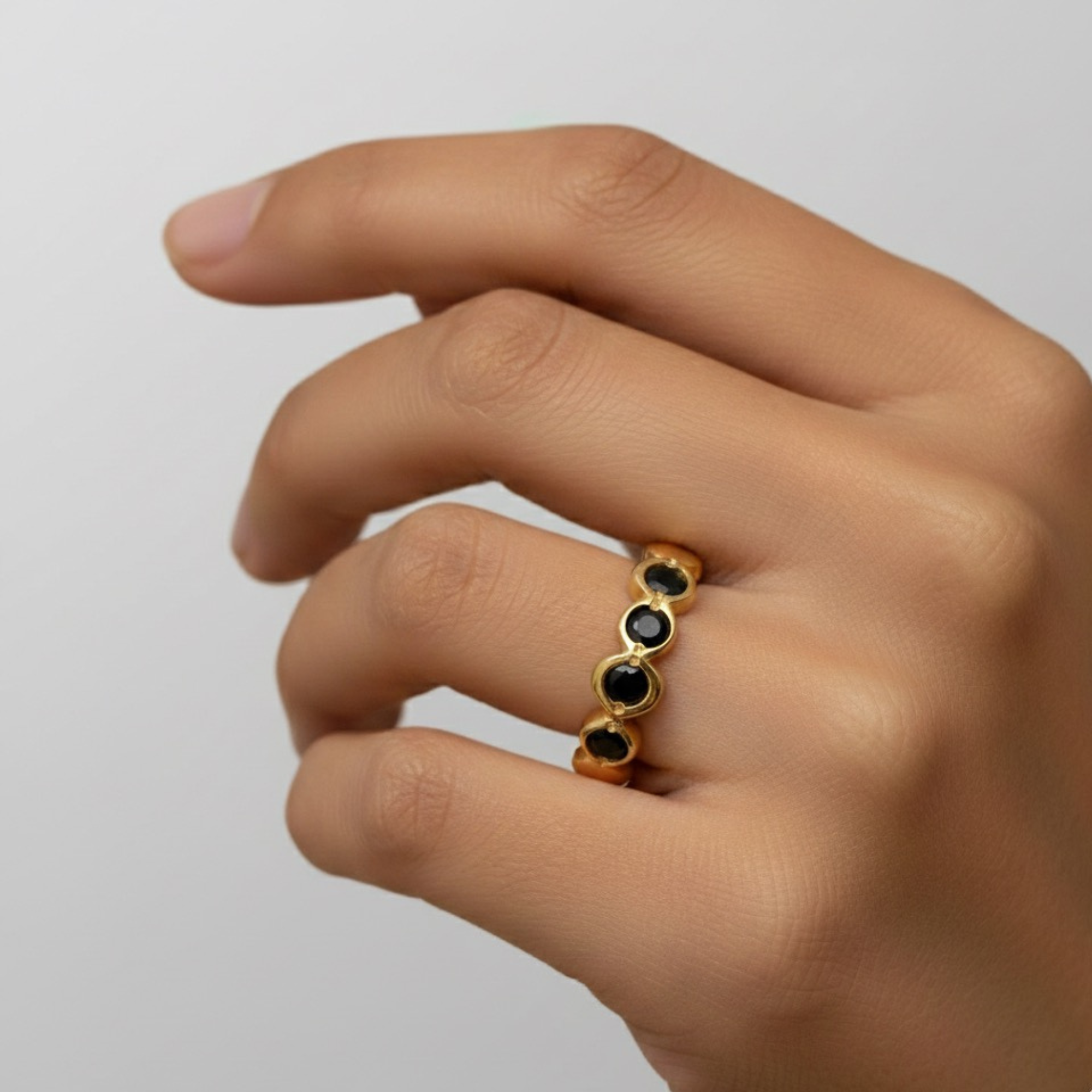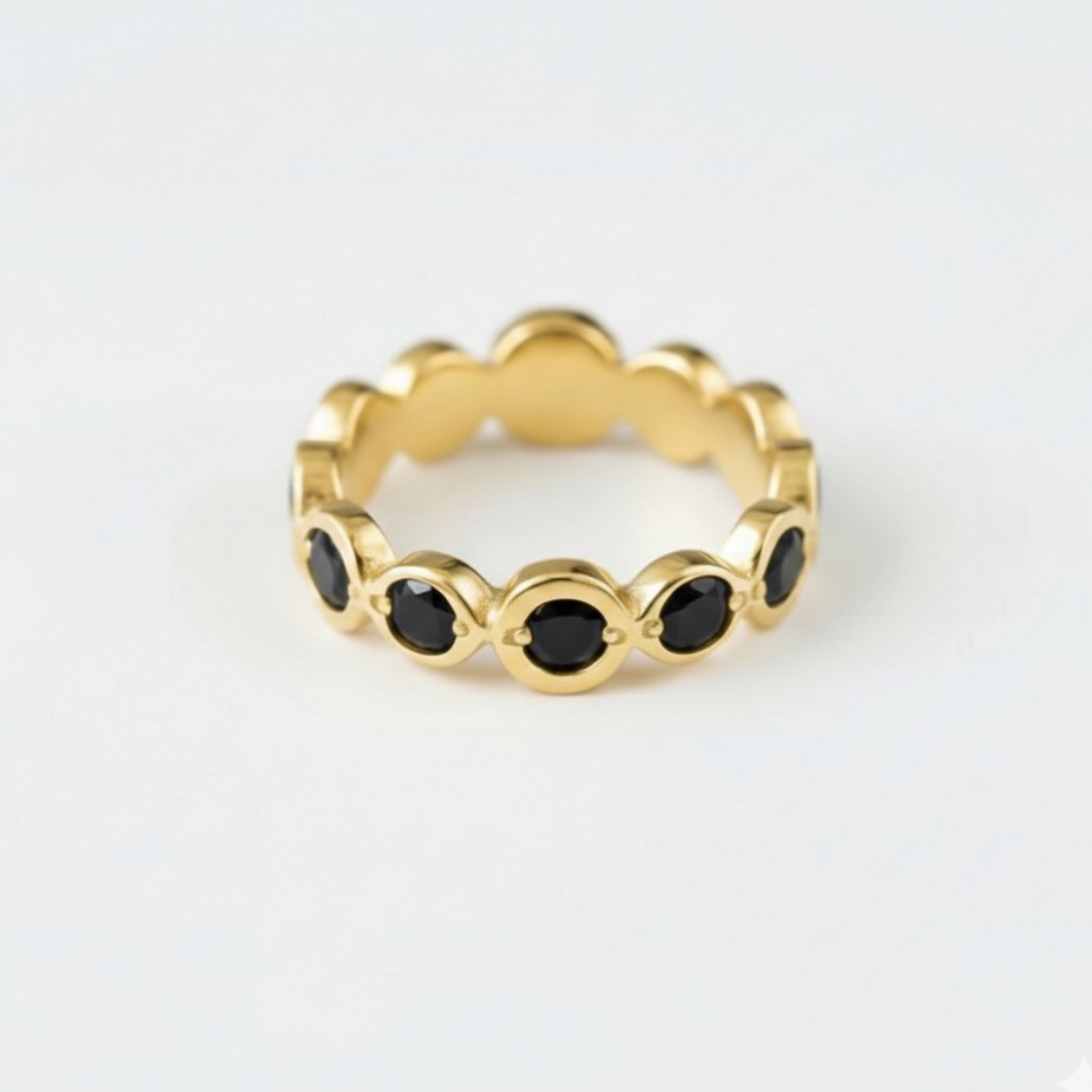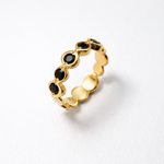 Gold Onyx Band set with a Natural Onyx in a diamond cut & natural black color, at 3mm diameter, 1Ct combined, from the Baltic Sea. Band width 3.2mm. Gold Vermeil: 18k Gold over Solid 925 Sterling Silver☞ made to last.