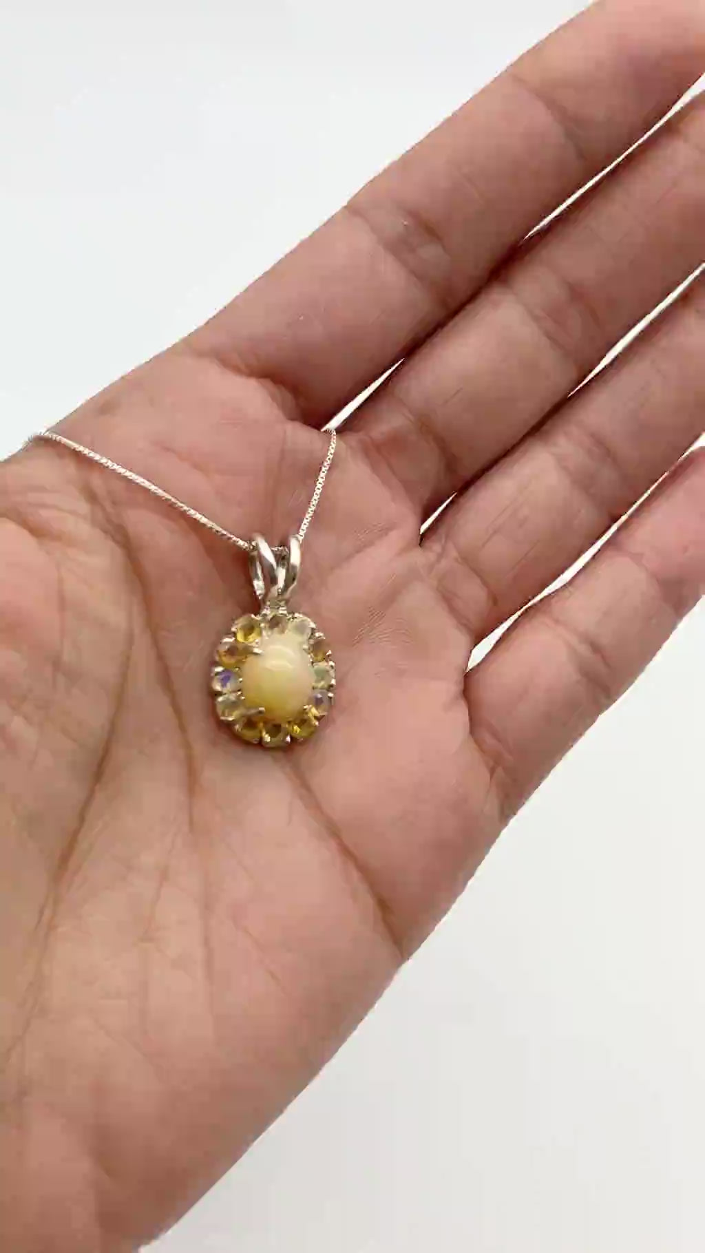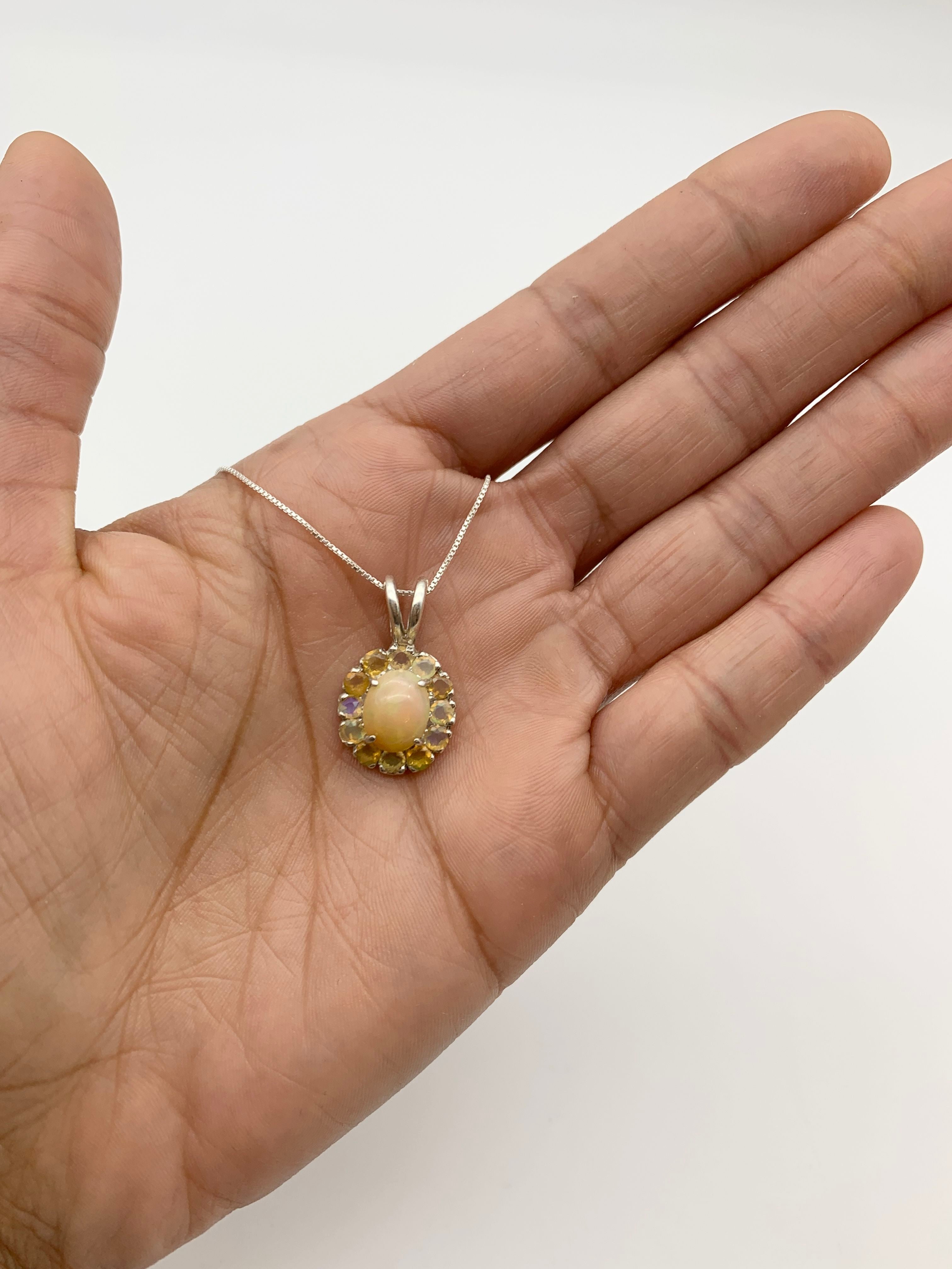 Natural Fire Opal Pendant set with Natural Ethiopian Opal in cabochon cut & natural color flashes at 10x8mm & Small Ethiopian Opals in diamond cut at 3mm diameter.