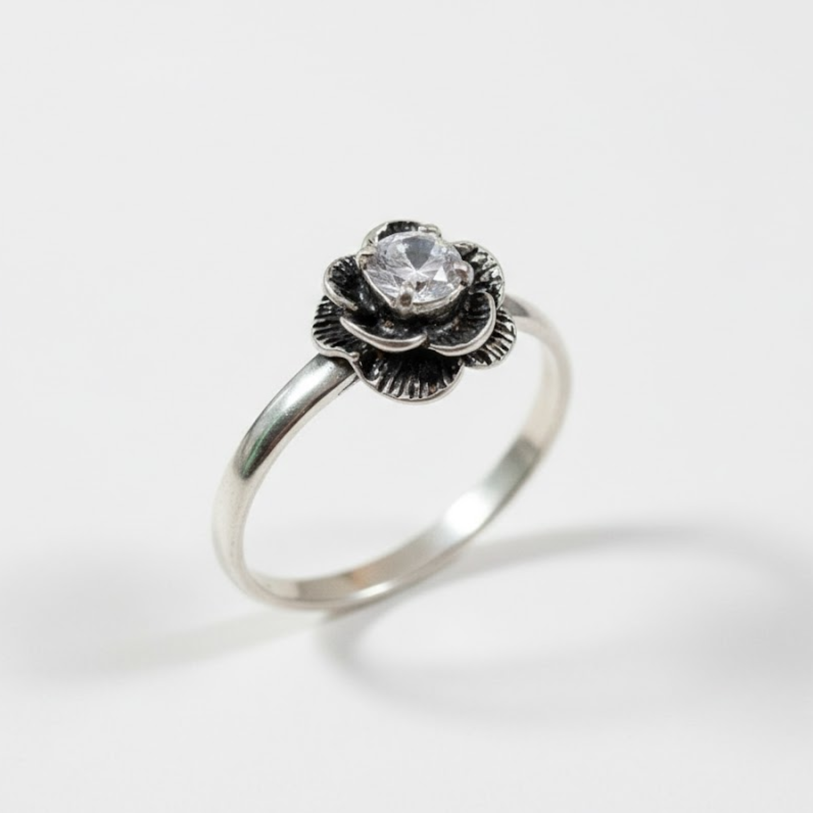 Flower Diamond Ring - Silver Flower Ring, White Diamond Ring