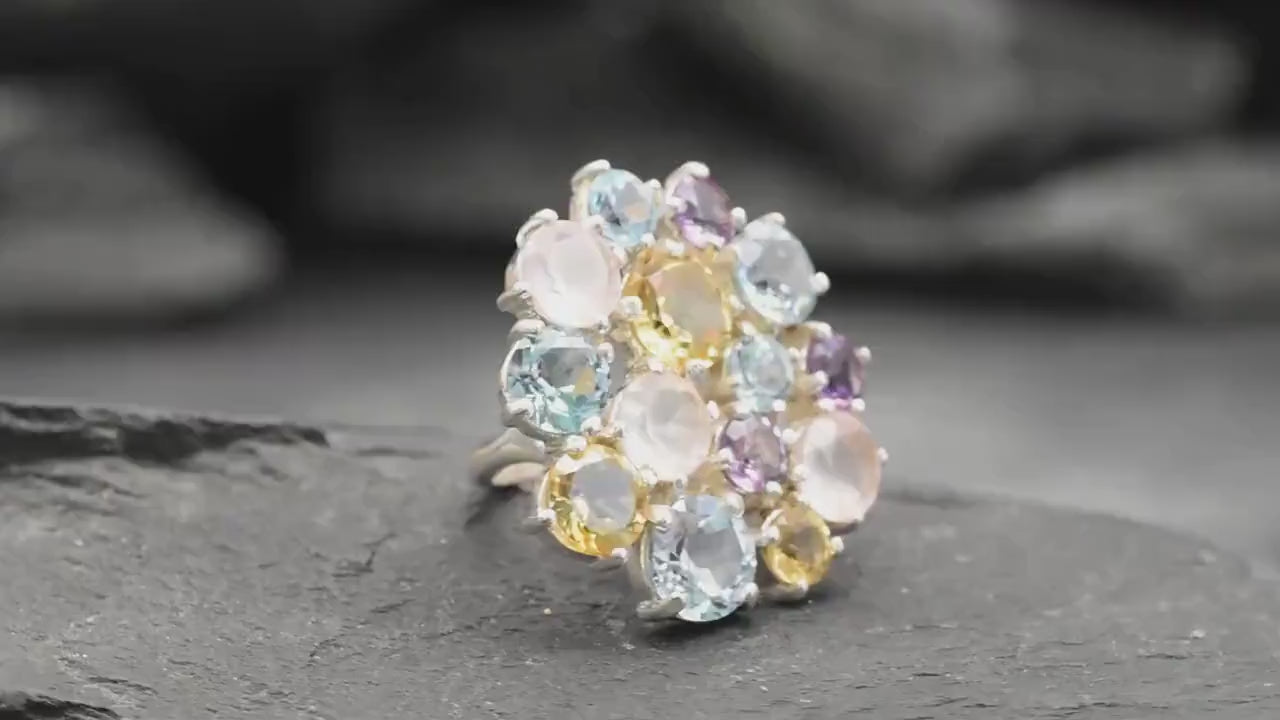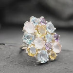 Multistone Ring, Natural Rose Quartz, Natural Blue Topaz, Amethyst Ring, Citrine Ring, Flower Ring, Cocktail Ring, Unique Ring, Solid Silver