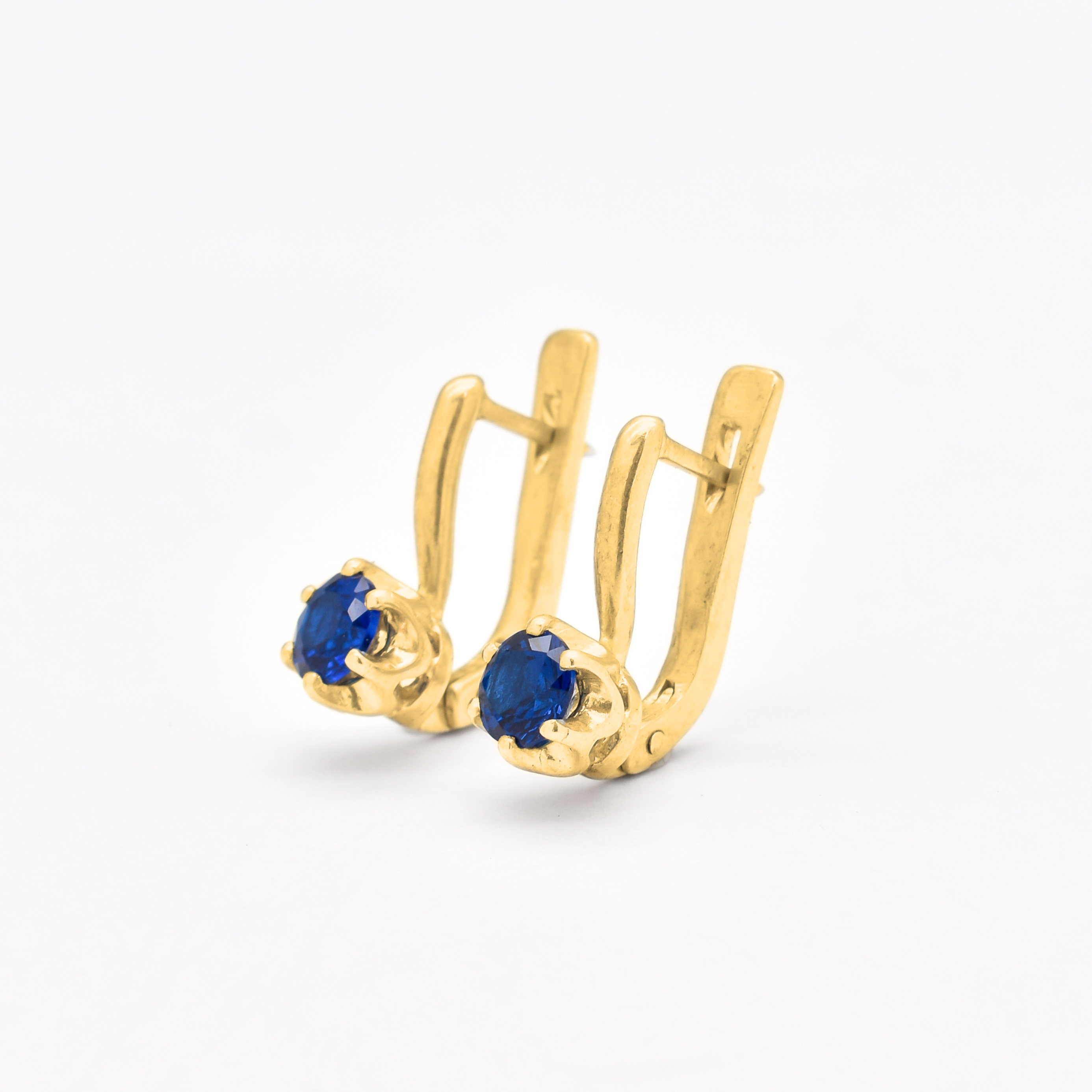 Gold Sapphire Earrings set with a Created Sapphire in a perfect diamond cut, flawless clarity & rich royal blue color, 5mm diameter (1 Ct a pair).