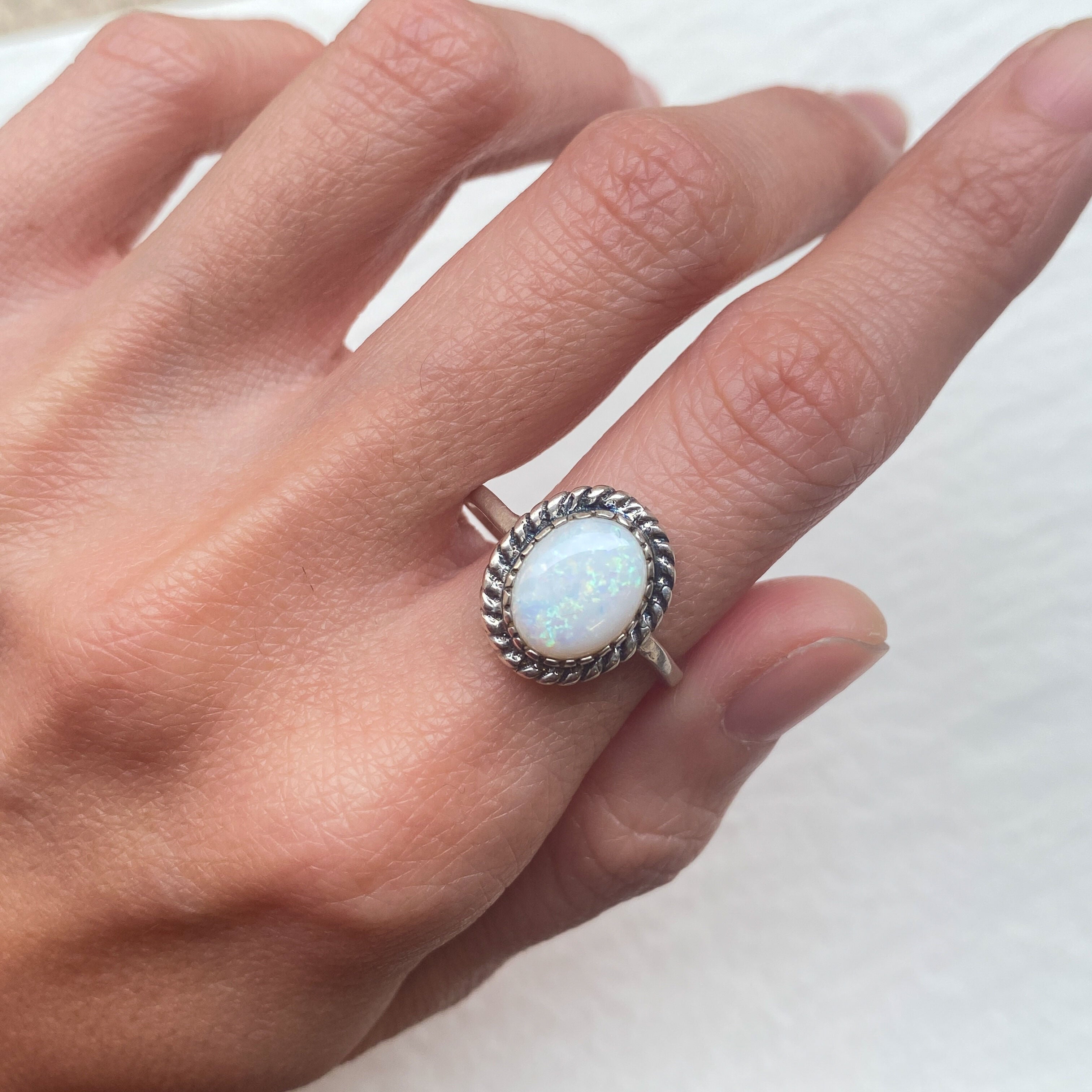 Natural Australian Opal sterling silver ring with an oval cabochon cut gemstone framed by a detailed rope-edge design, offering a timeless and elegant style. Opal, the October birthstone, is valued for enhancing creativity and emotional harmony, making it an ideal gift for birthdays, anniversaries, weddings, and milestone celebrations.