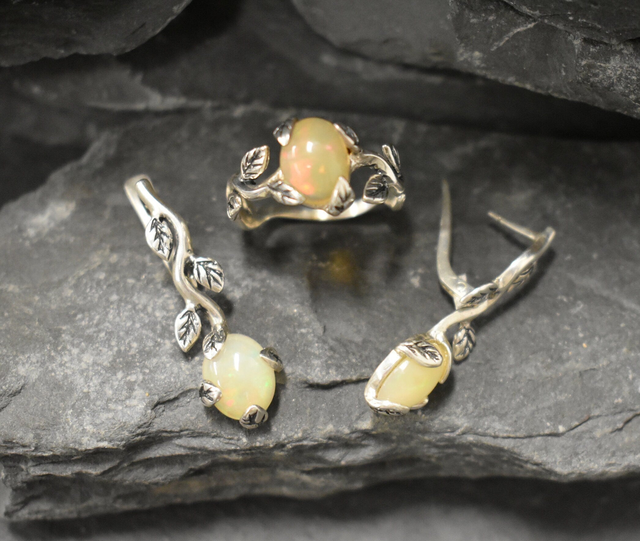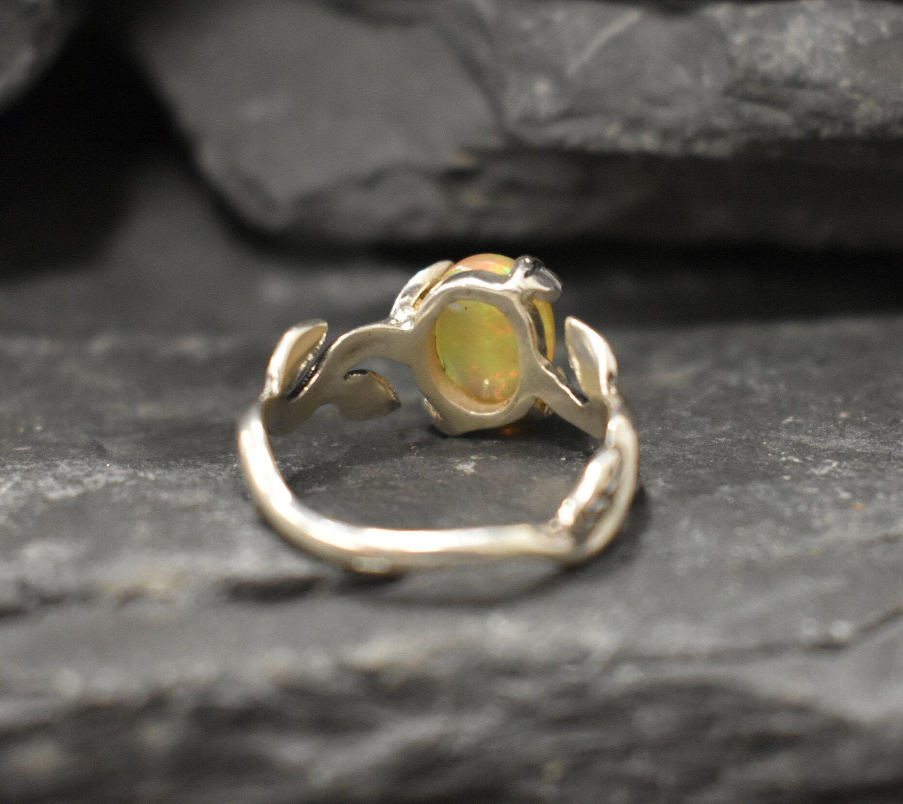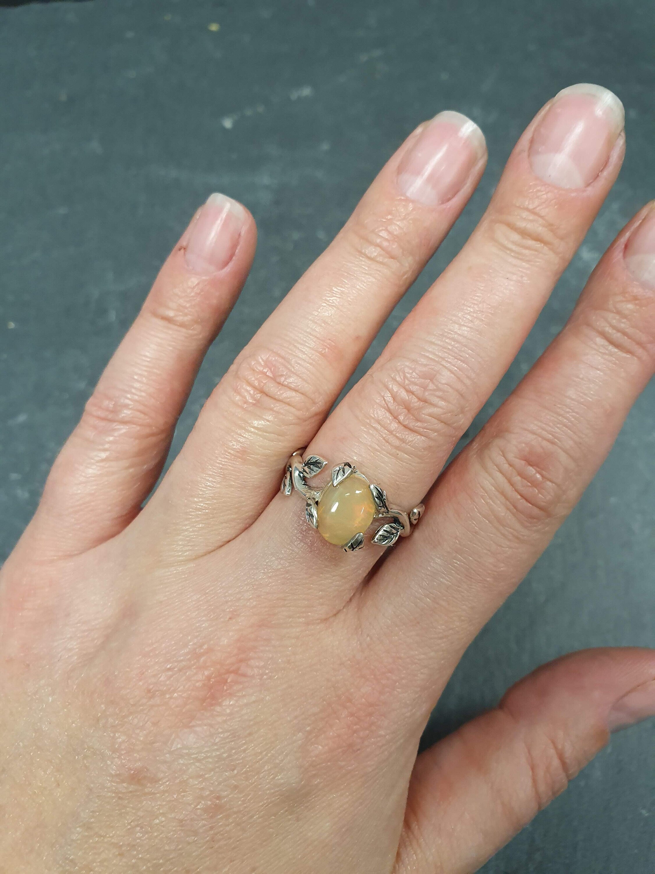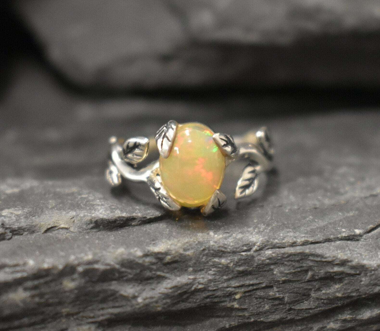 Opal Vine Ring in sterling silver with a cabochon cut gemstone framed by leaf and branch accents, a nature-inspired jewelry style that brings elegance and grounding energy with flashes of fire colors, making it a meaningful October birthstone gift idea. Perfect to wear at weddings, anniversaries, and outdoor celebrations for a radiant yet earthy look.