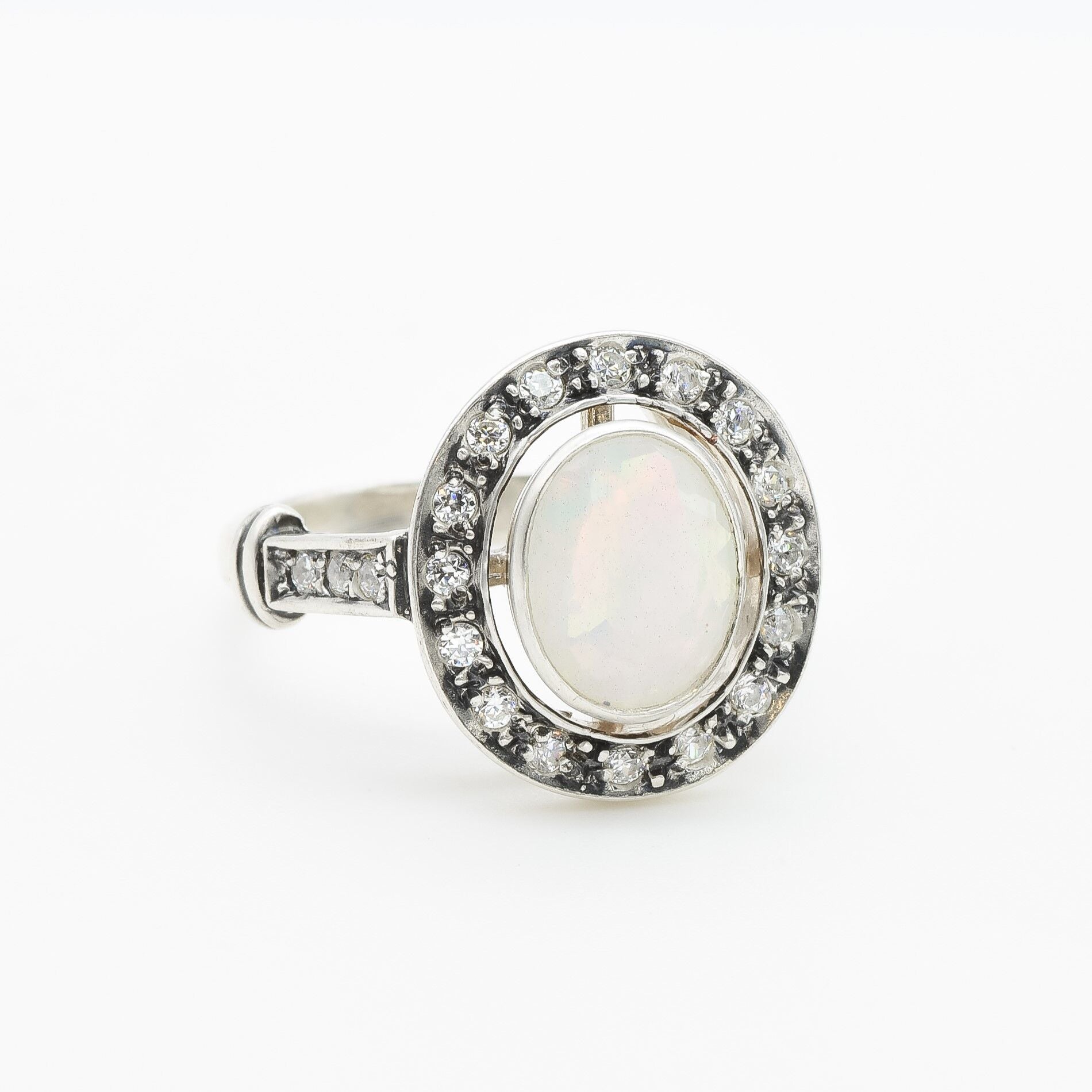 White Opal oval bezel halo ring with Victorian vintage design in solid 925 sterling silver, featuring flashes of fire colors for energy and inspiration, perfect as an October birthstone gift and for engagements, anniversaries, or elegant celebrations.