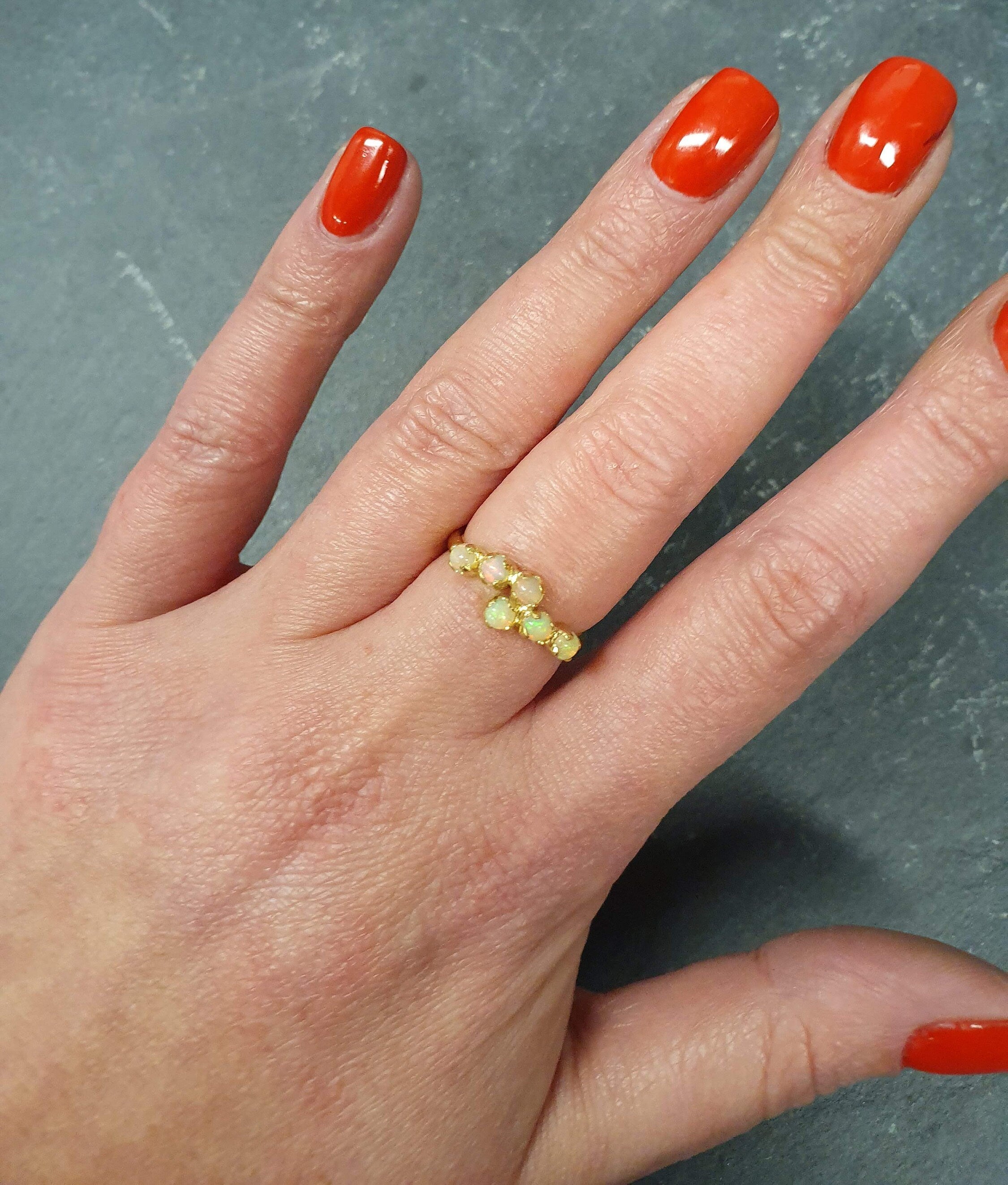 Flower Opal Ring worn on middle finger with natural nails, crafted with six cabochon stones in a curved bypass band, symbolic as an October birthstone gift, ideal for anniversaries and elegant dinner dates.