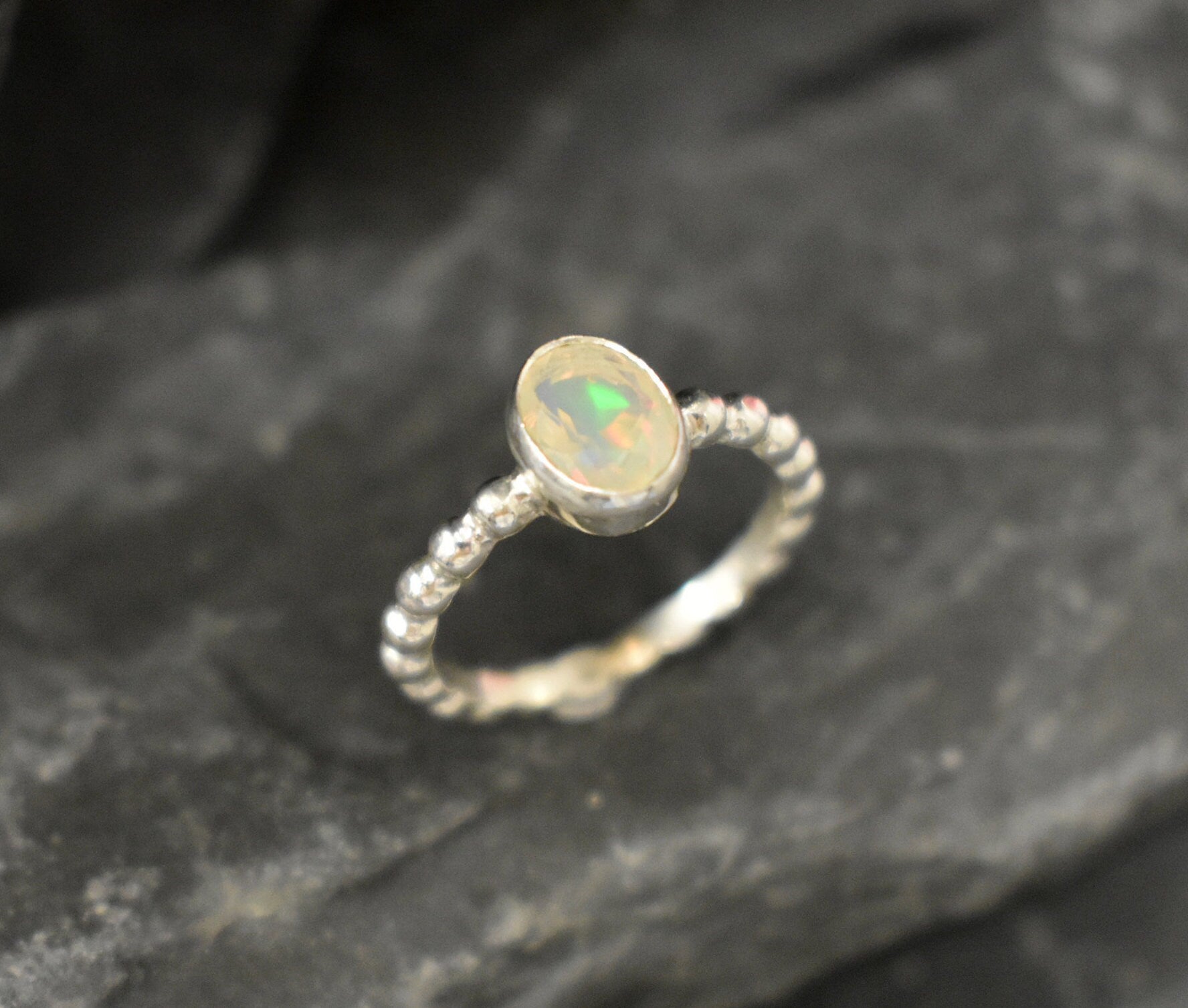 Fire Opal Bezel Bubble Band – October Birthstone Dainty Ring – Sterling Silver Color Flash Band