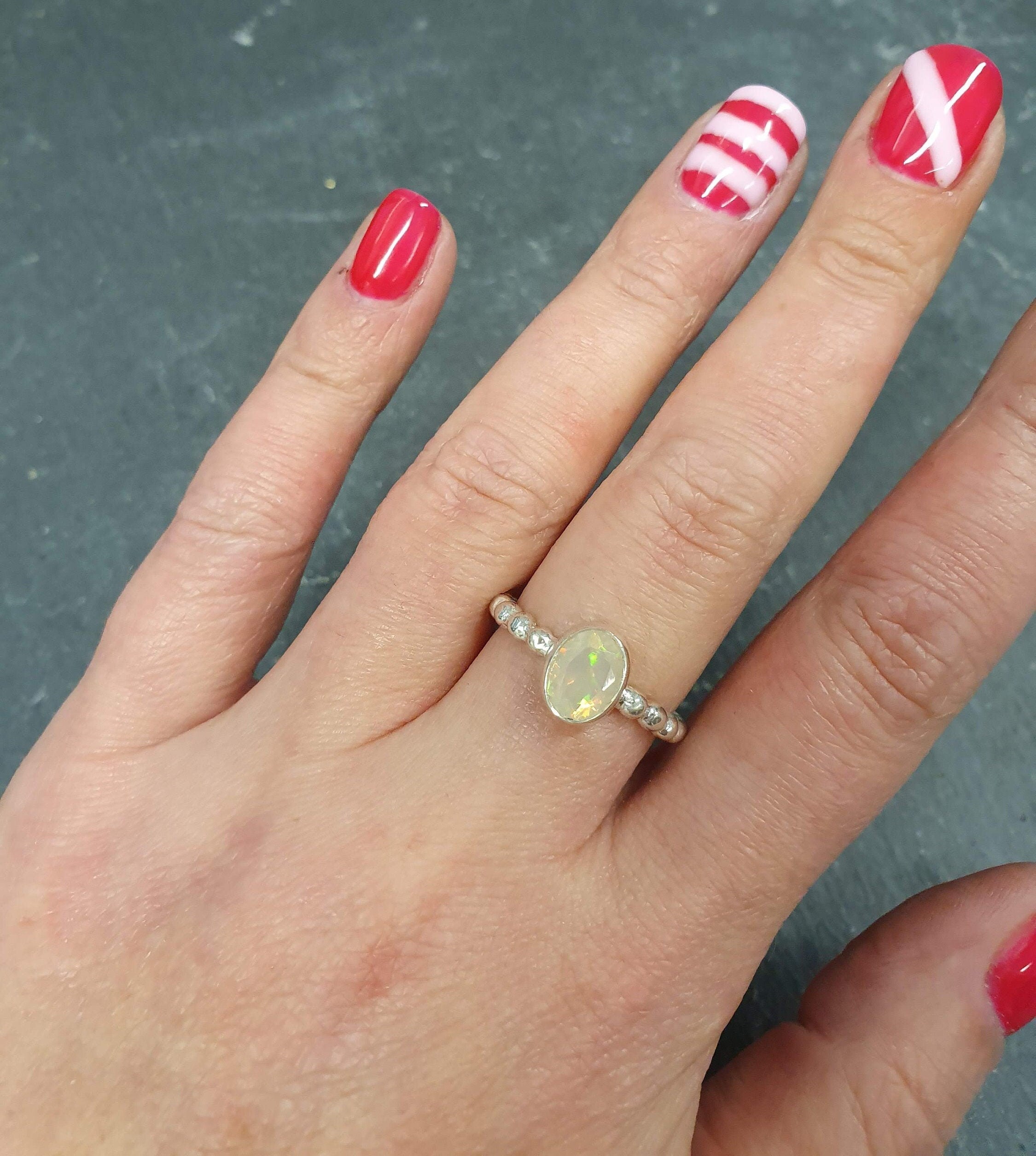 Fire Opal Ring worn on middle finger with bright red nails, styled with striped accent nail art, perfect for expressing individuality and charm, makes a thoughtful October birthstone gift, ideal for casual outings and birthday parties.