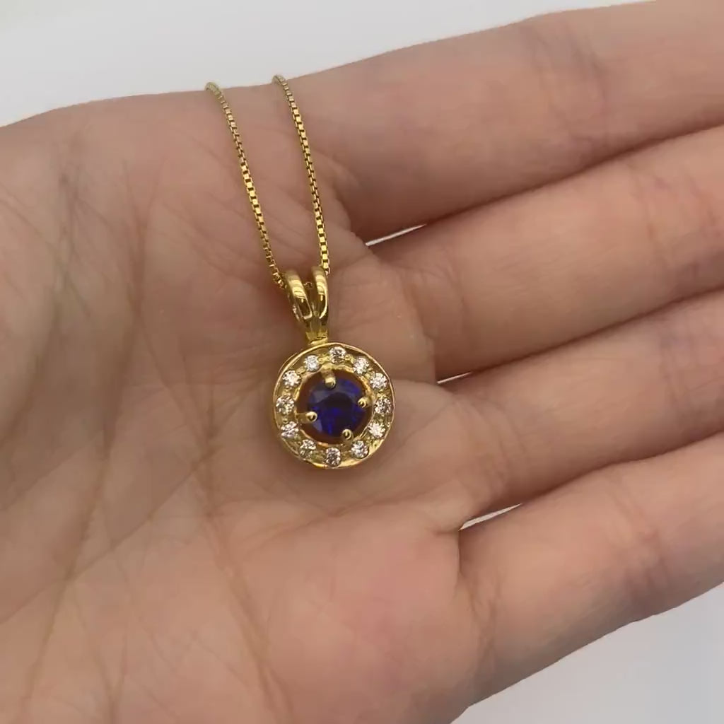 Gold Sapphire Pendant set with Created Sapphire in a flawless clarity, diamond cut & royal blue color, at 5mm (0.5 Cts) surrounded by CZ Diamonds.