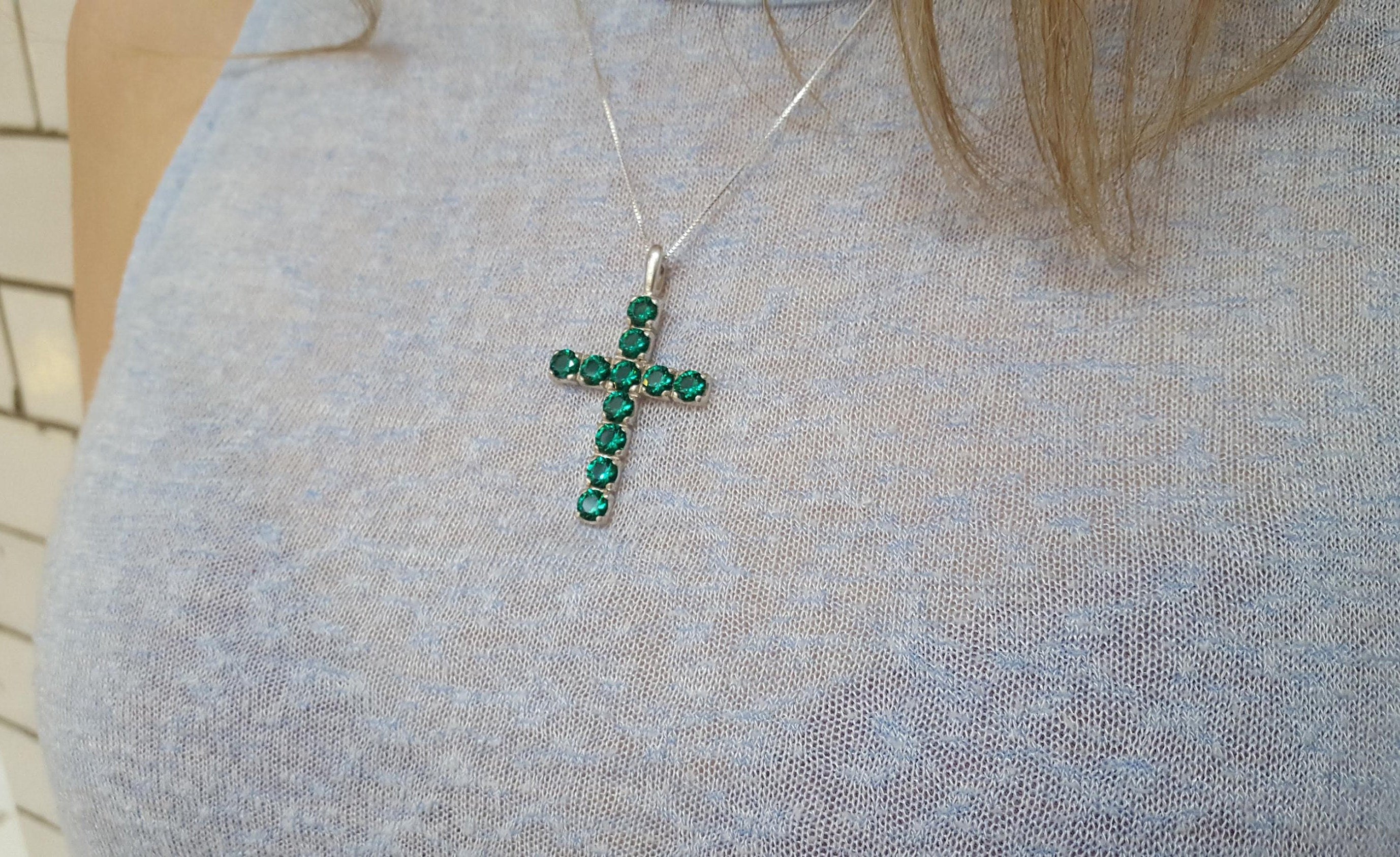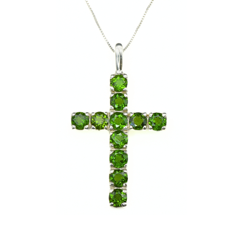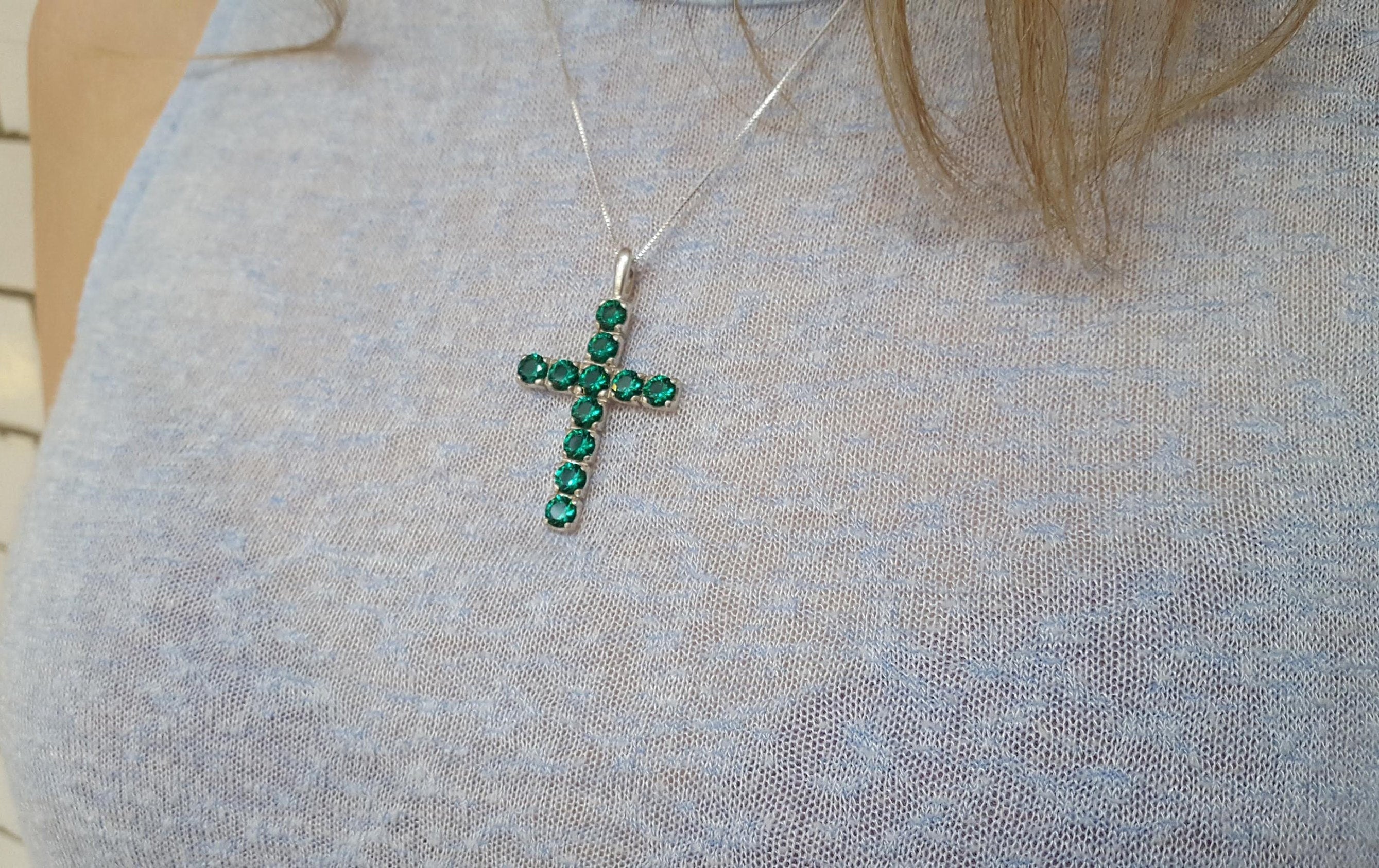 Chrysoprase and Emerald pendant in a cross design, perfect for layering style