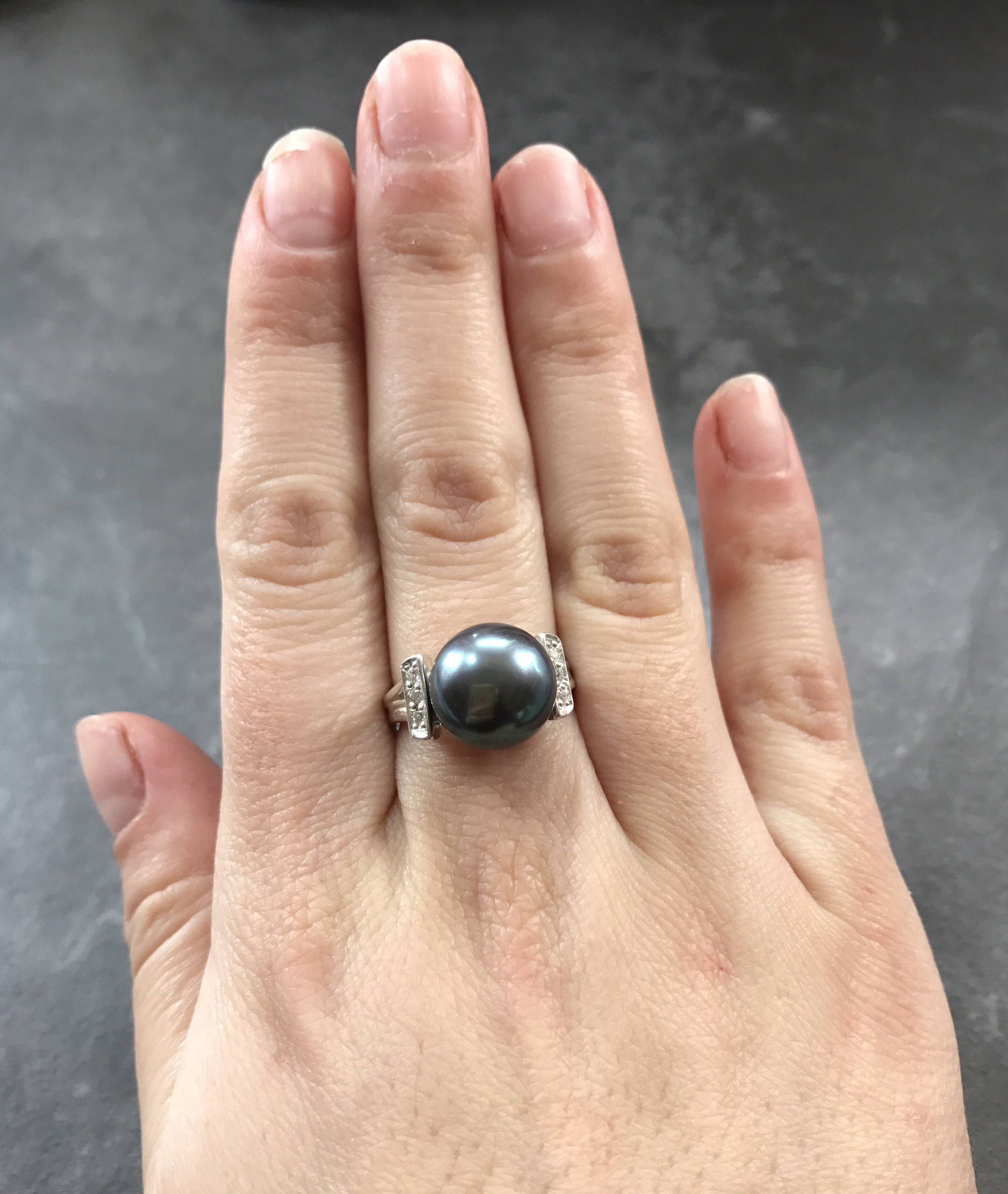 Genuine Pearl Ring set with a Natural Black Pearl in a large size & unique natural Grey/ rainbow flash in AAA Grade, from Japan.