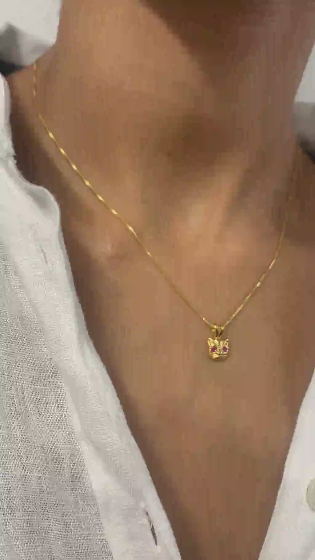 Gold Cat Necklace set with a Natural Ruby in a diamond cut & red color, at 3mm each (0.3 Cts combined) from Burma.