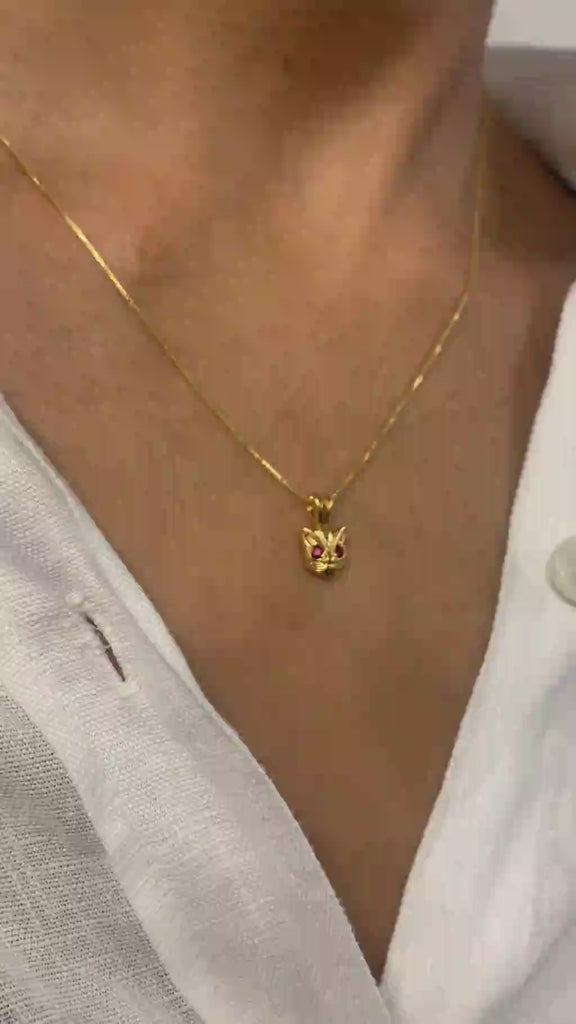 Gold Cat Ruby Pendant - Red Eyed Cat Necklace, Cat Lover Necklace
