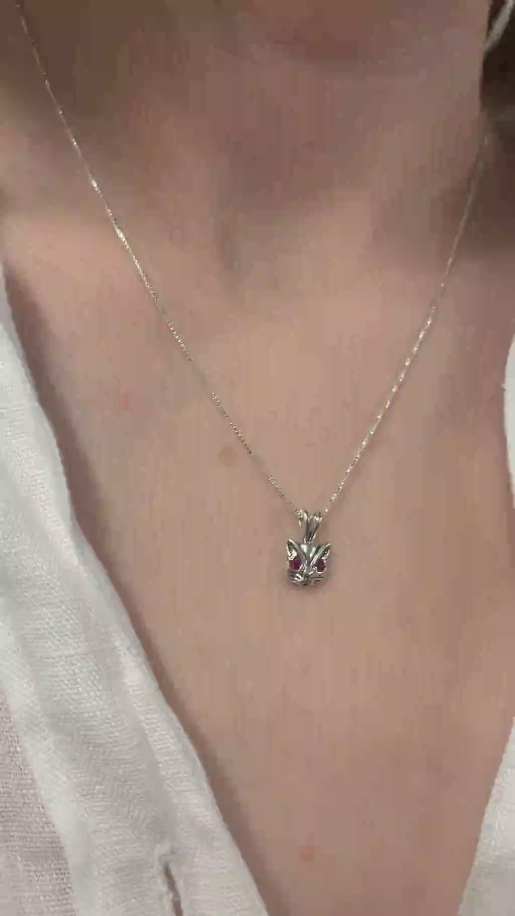 Ruby Cat Pendant set with Created Ruby in a diamond cut & bright red color at 3mm each.