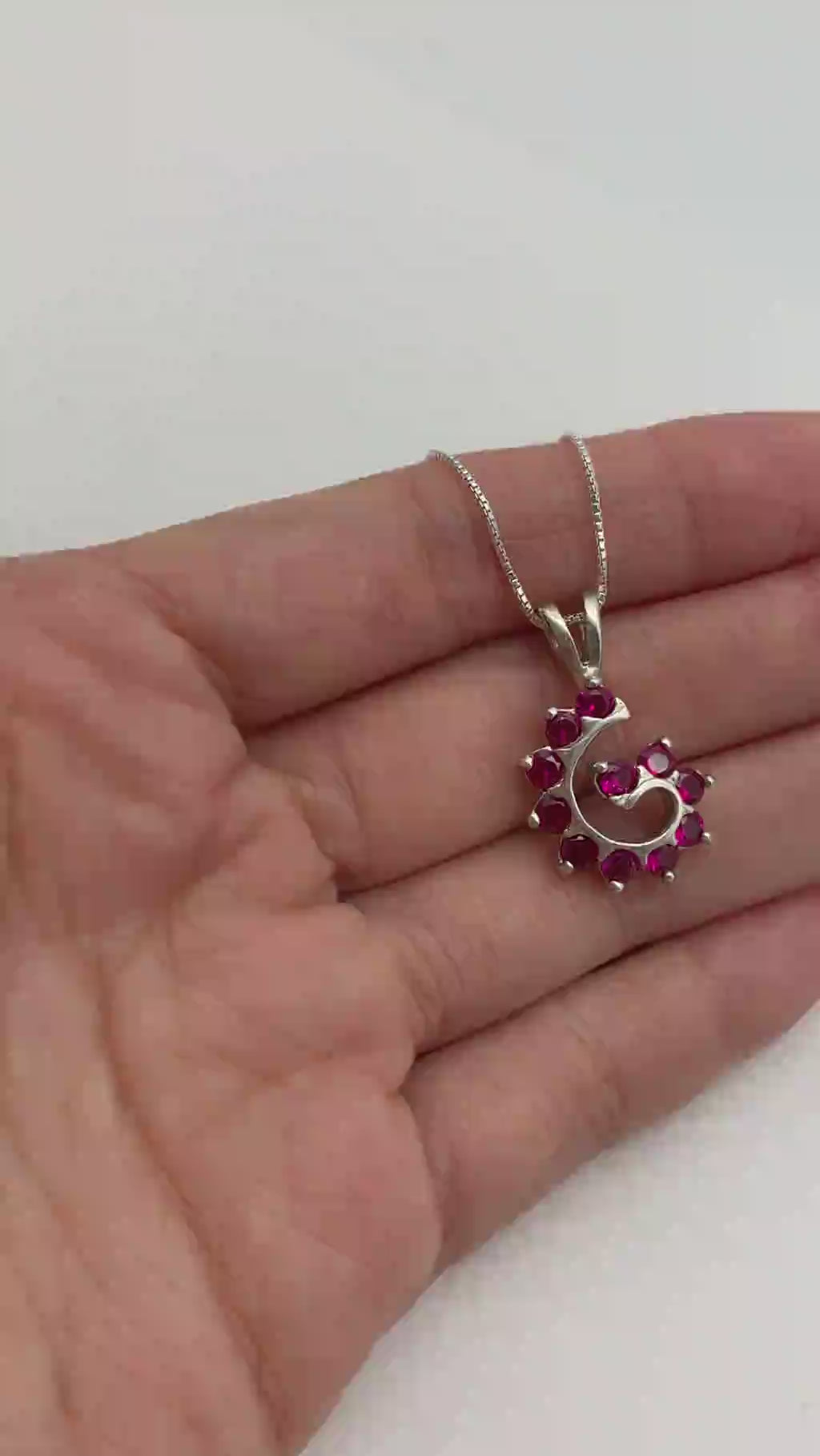 Spiral Ruby Pendant set with Created Ruby in a diamond cut & deep red color, at 3mm size each, (1.5 Cts combined).