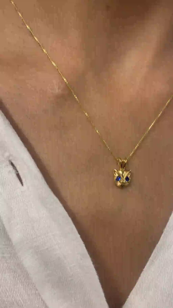 Gold Cat Pendant - Blue Sapphire Necklace, Cat Lover Pendant