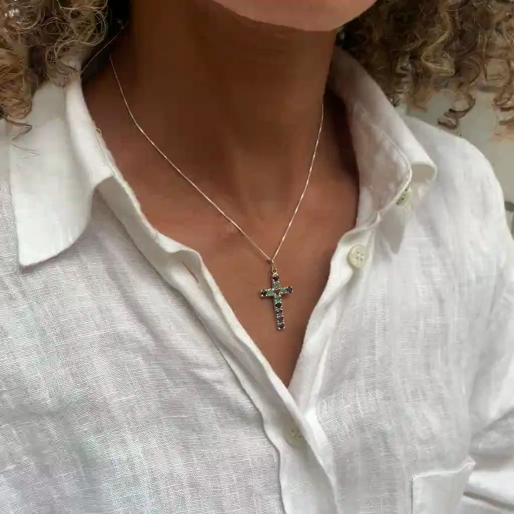 Sapphire Cross Pendant set with Natural Sapphire, Ruby, & Emerald in flawless clarity, diamond cut, at 3mm each, 1.3 Carats combined.