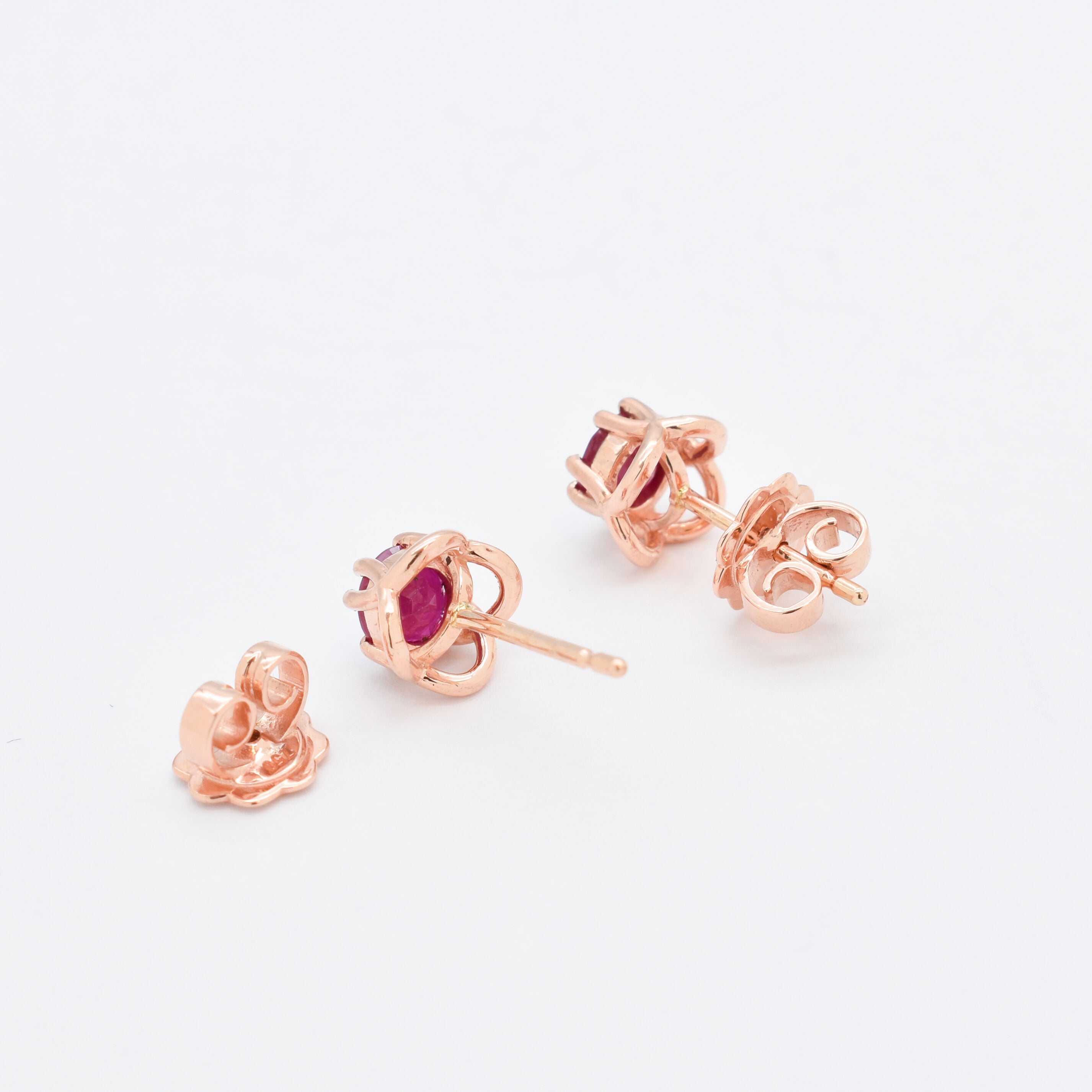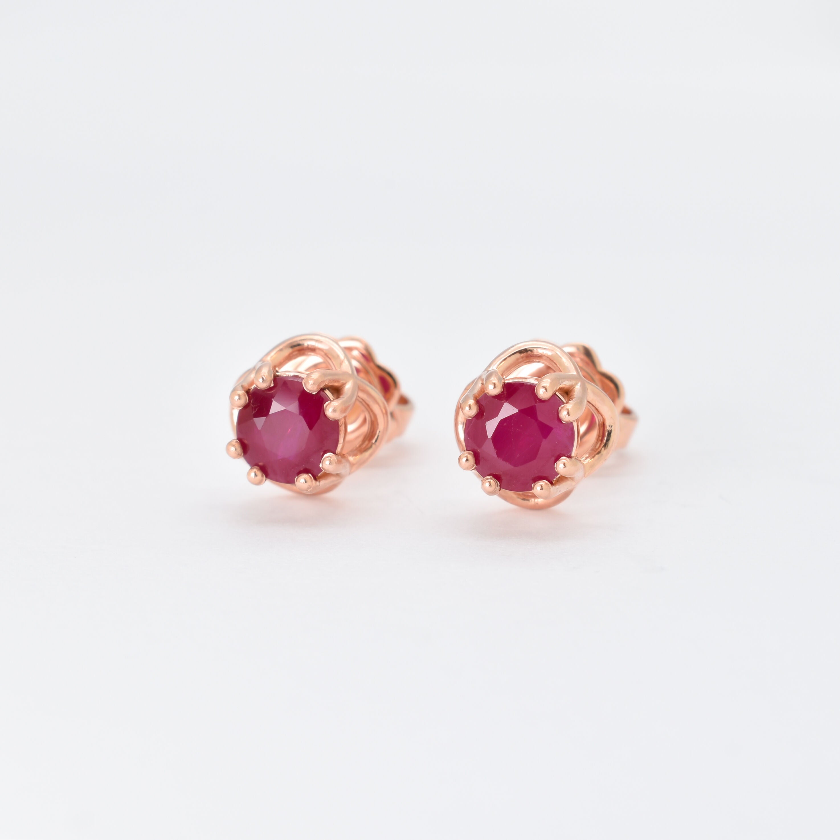 Solid 14k Rose Gold Earrings set with Natural Ruby, in round cut, and prong setting, with natural red color.