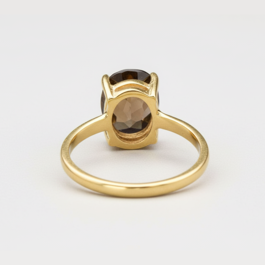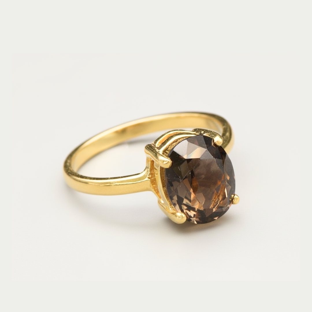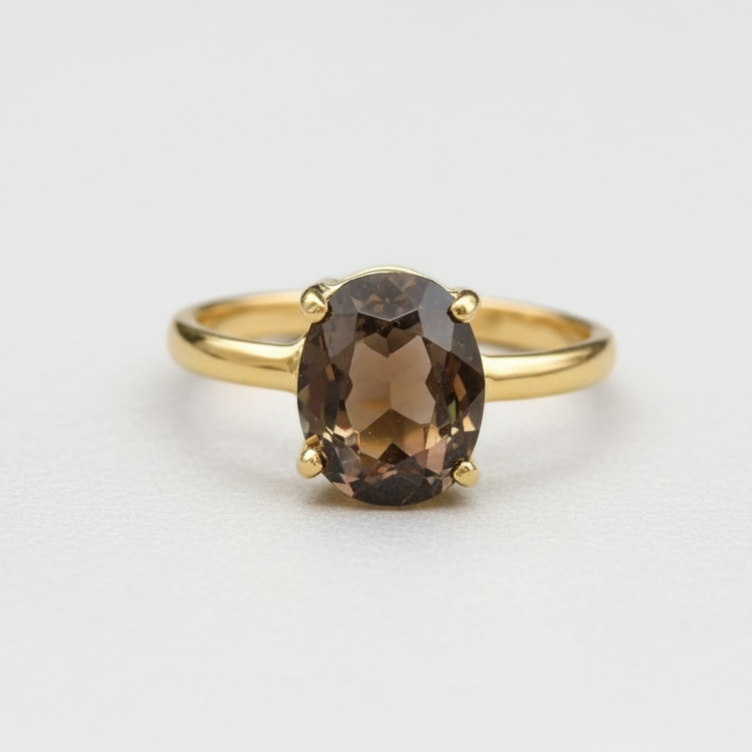 Smoky Topaz Solitaire Ring set with a Natural Smoky Topaz in a perfect diamond cut, flawless clarity & deep brown color, at 10x8mm (3 Cts) from Brazil.