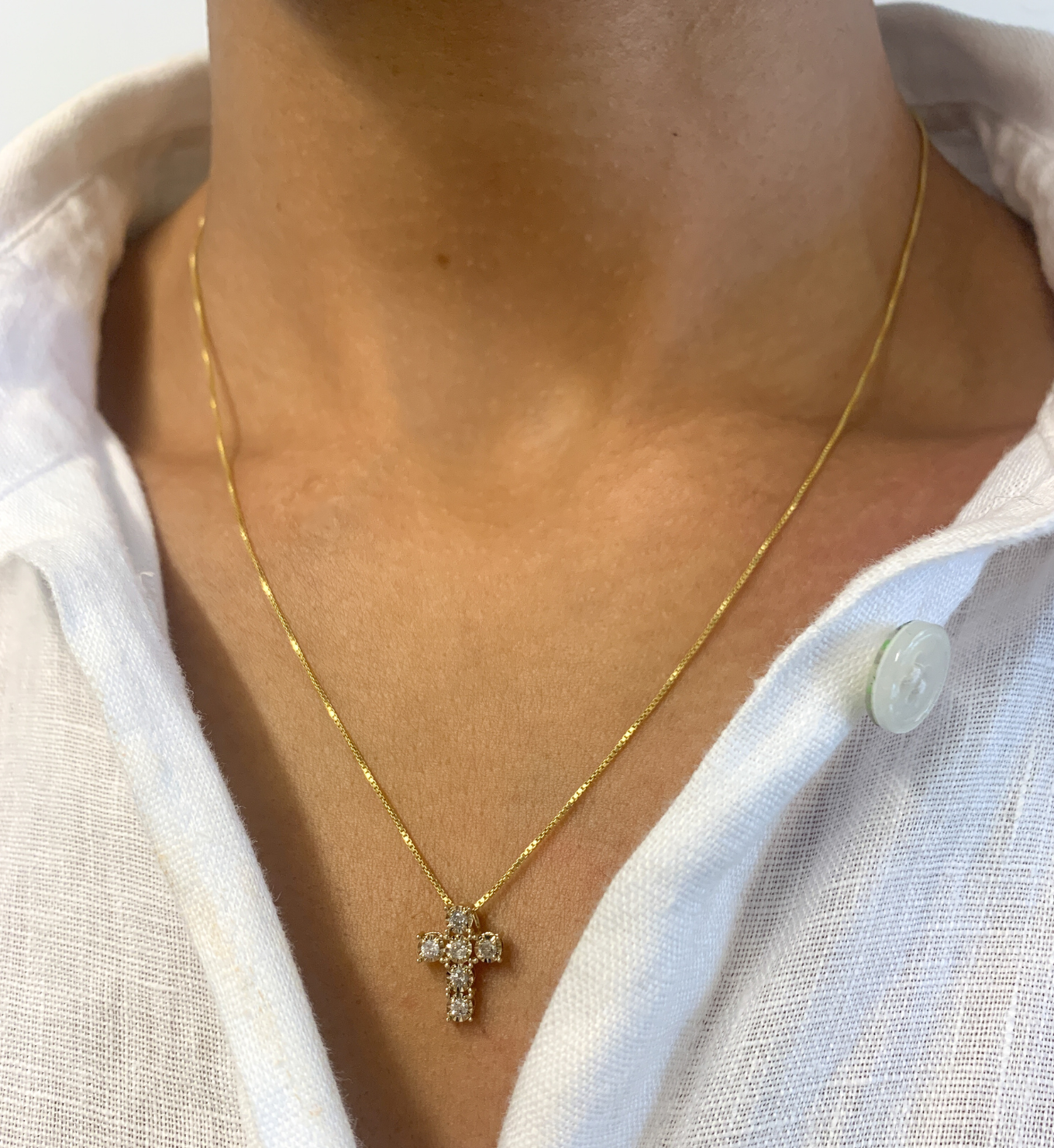 Woman wearing a Dainty Real Diamond Cross Necklace set in Solid 14k Yellow Gold. April birthstone in round cut, and stunning clarity, and in a prong setting. Symbolizing purity, and inner strength, ideal to wear on special occasions especially religious activities.