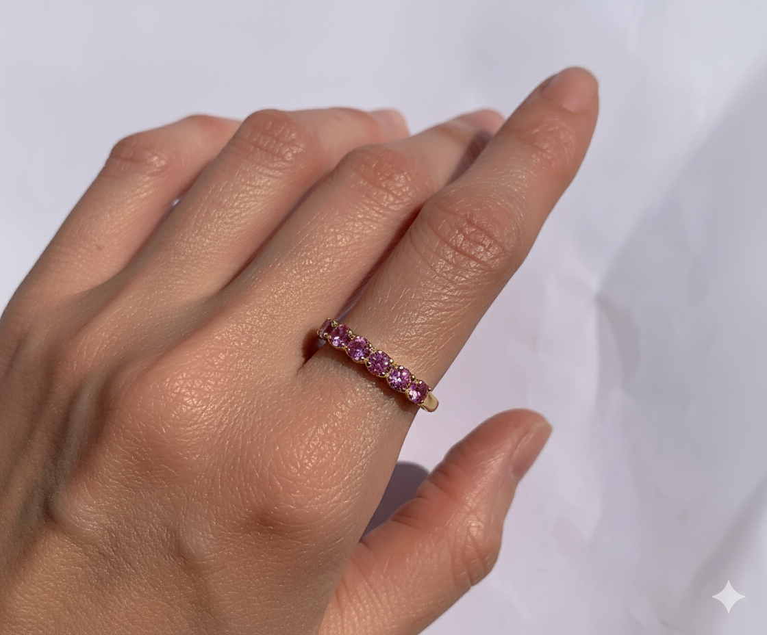 half Eternity Gold Band set with Natural Pink Tourmalines in a diamond cut & stunning pink color, at size 3mm each (1 Ct combined) from Madagascar.