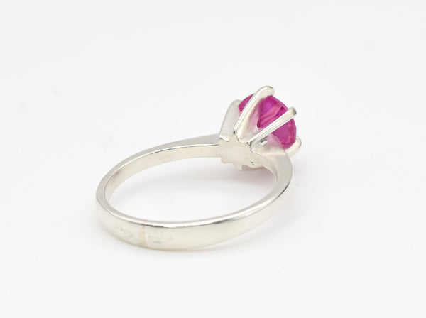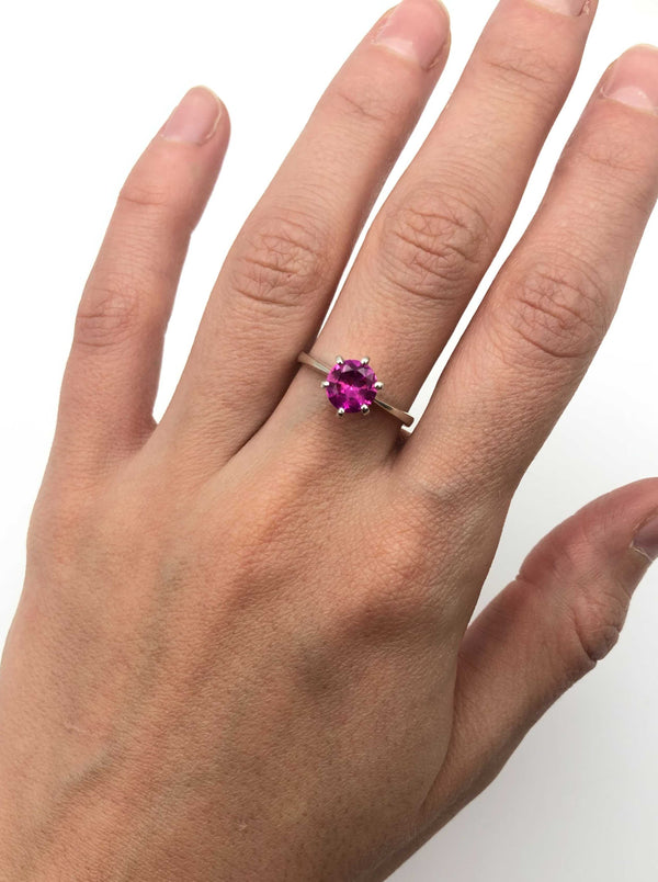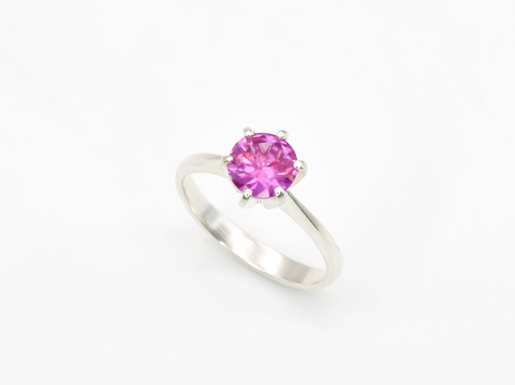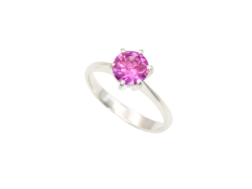Alexandrite Ring set with a Created Alexandrite in a perfect diamond cut & stunning pink color, at size 7mm (1.3 Cts).