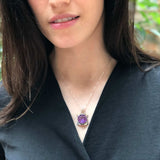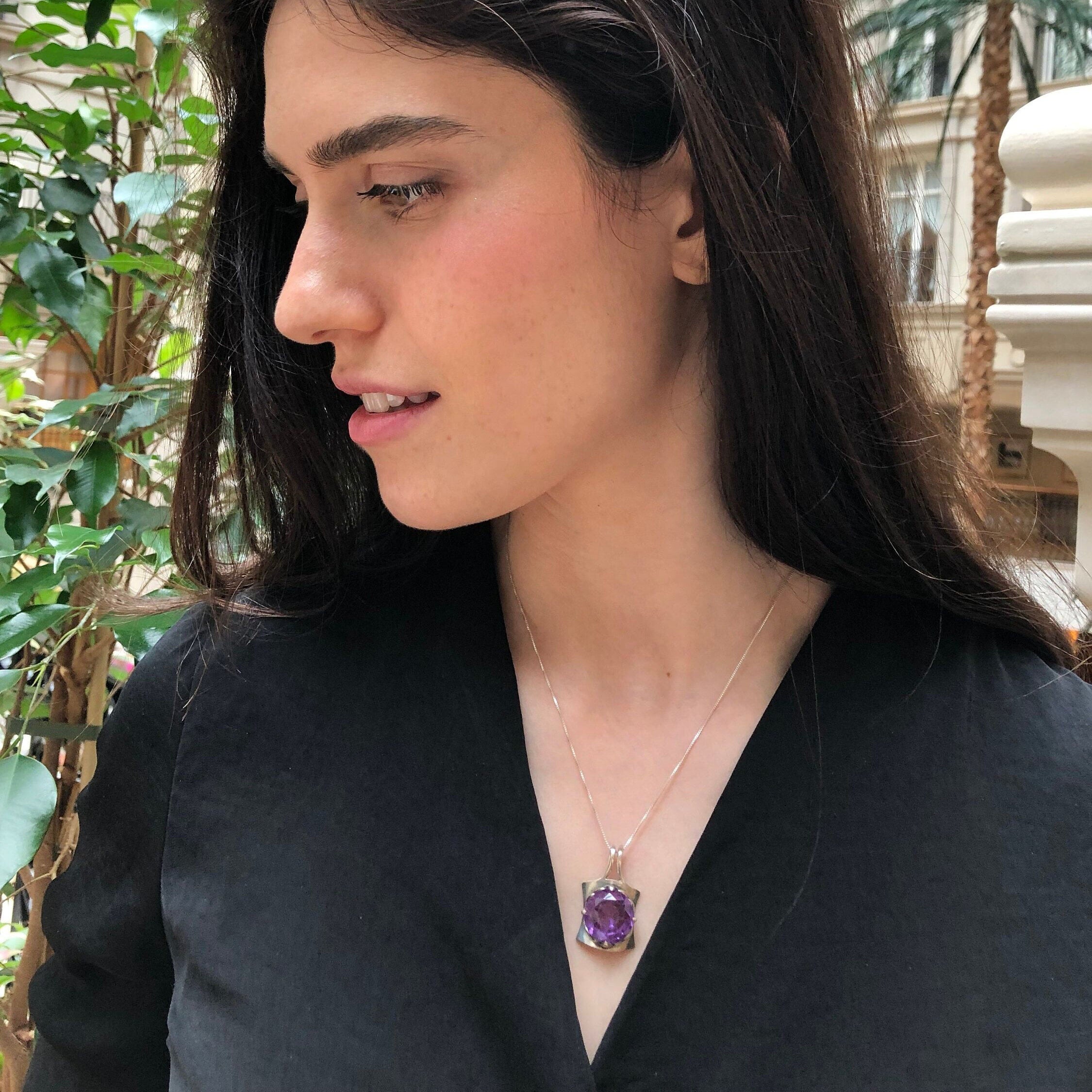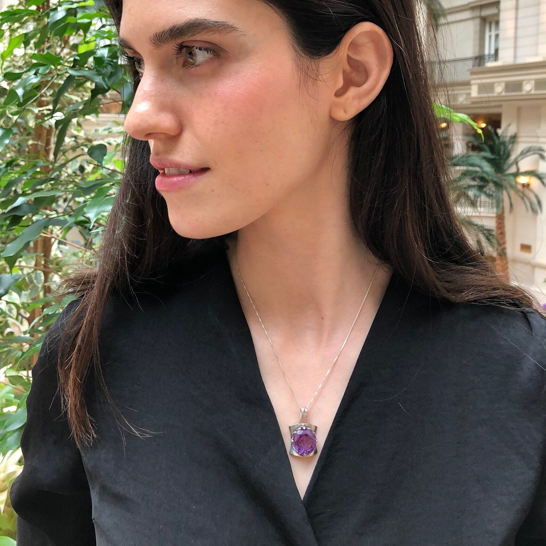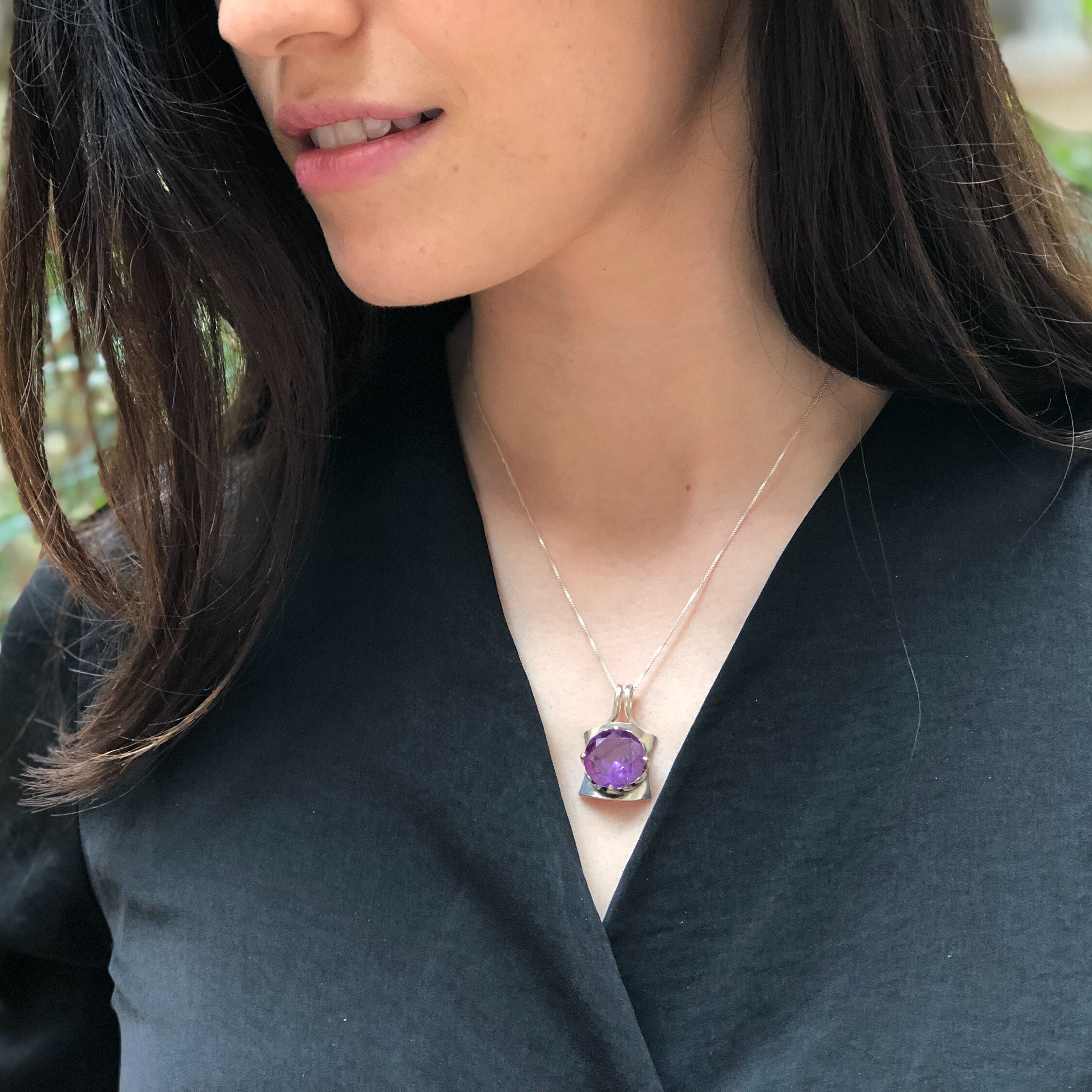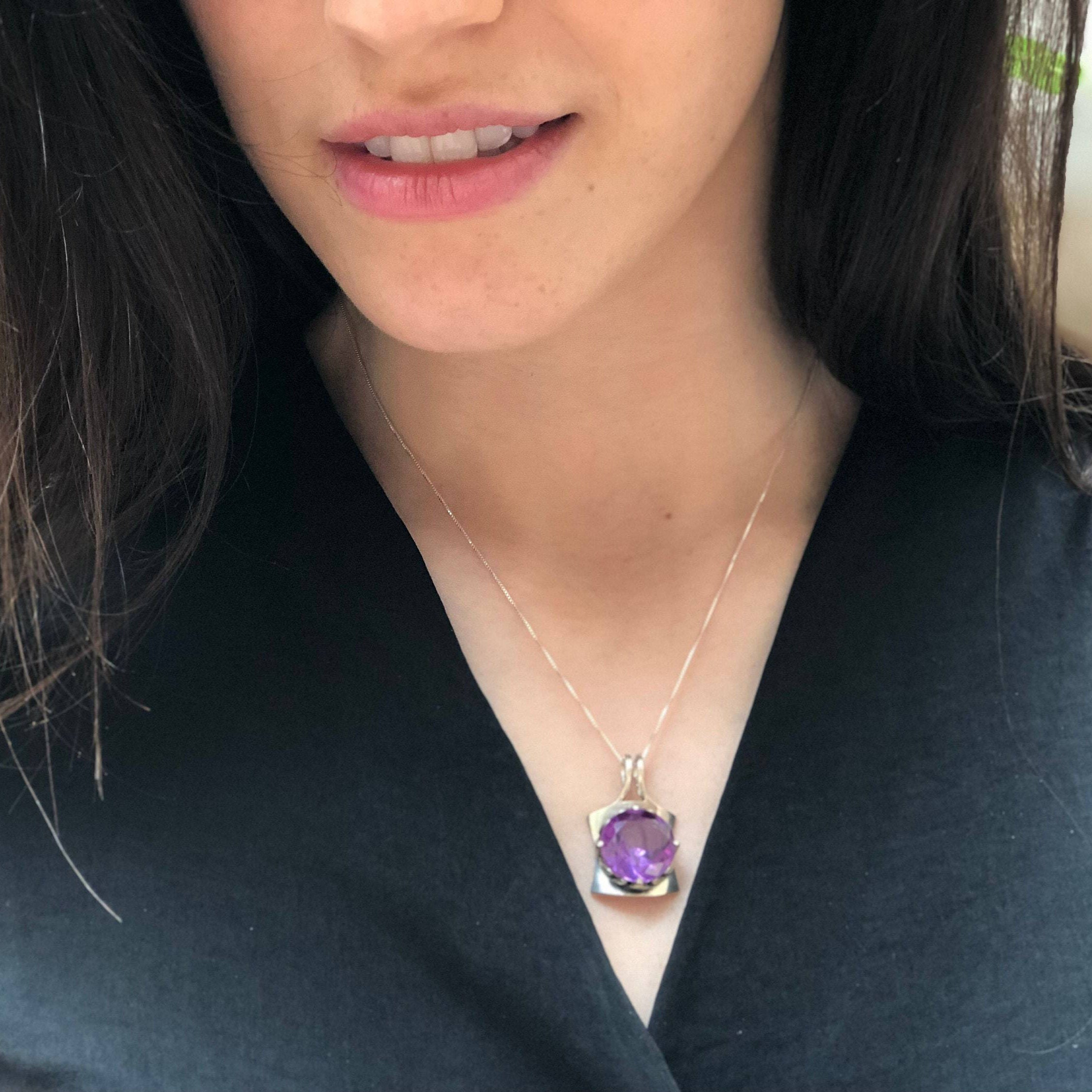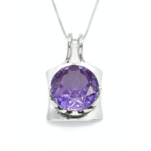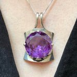 Large Amethyst Necklace set with a Natural Amethyst in a perfect diamond cut, flawless clarity & stunning purple color, at 15mm (13 Cts) from Brazil.