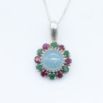 Aquamarine Flower Necklace set with Natural Aquamarine in a cabochon cut & sky blue color, at size 10mm together with Natural Emerald & Ruby at size 3mm (5 Cts combined).
