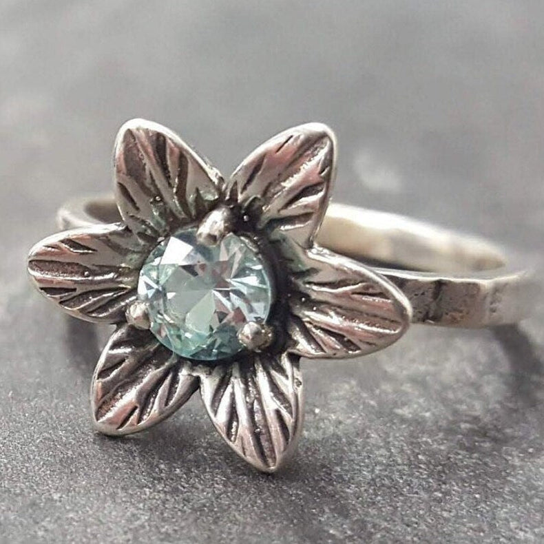 Aquamarine Ring, Created Aquamarine, Flower Ring, Blue Vintage Ring, Aqua Ring, Silver Flower Ring, Vintage Flower Ring, Solid Silver Ring