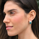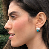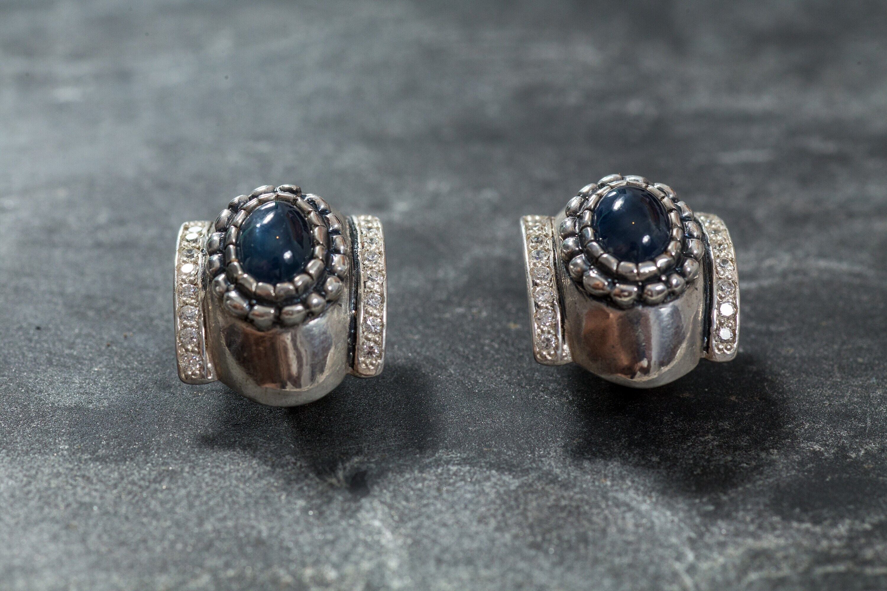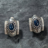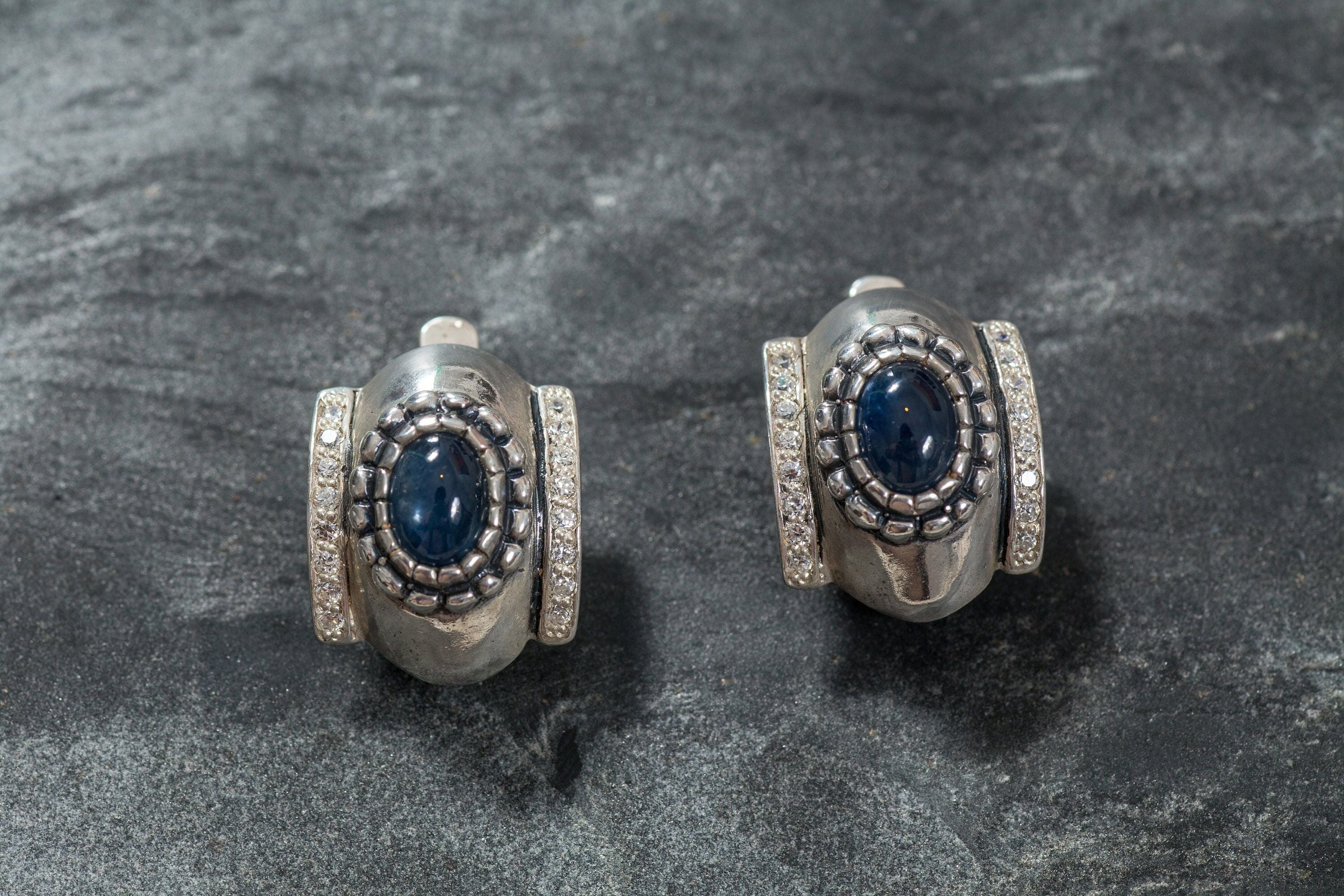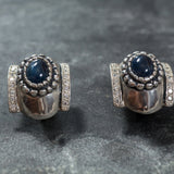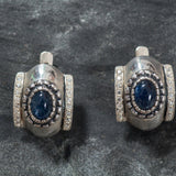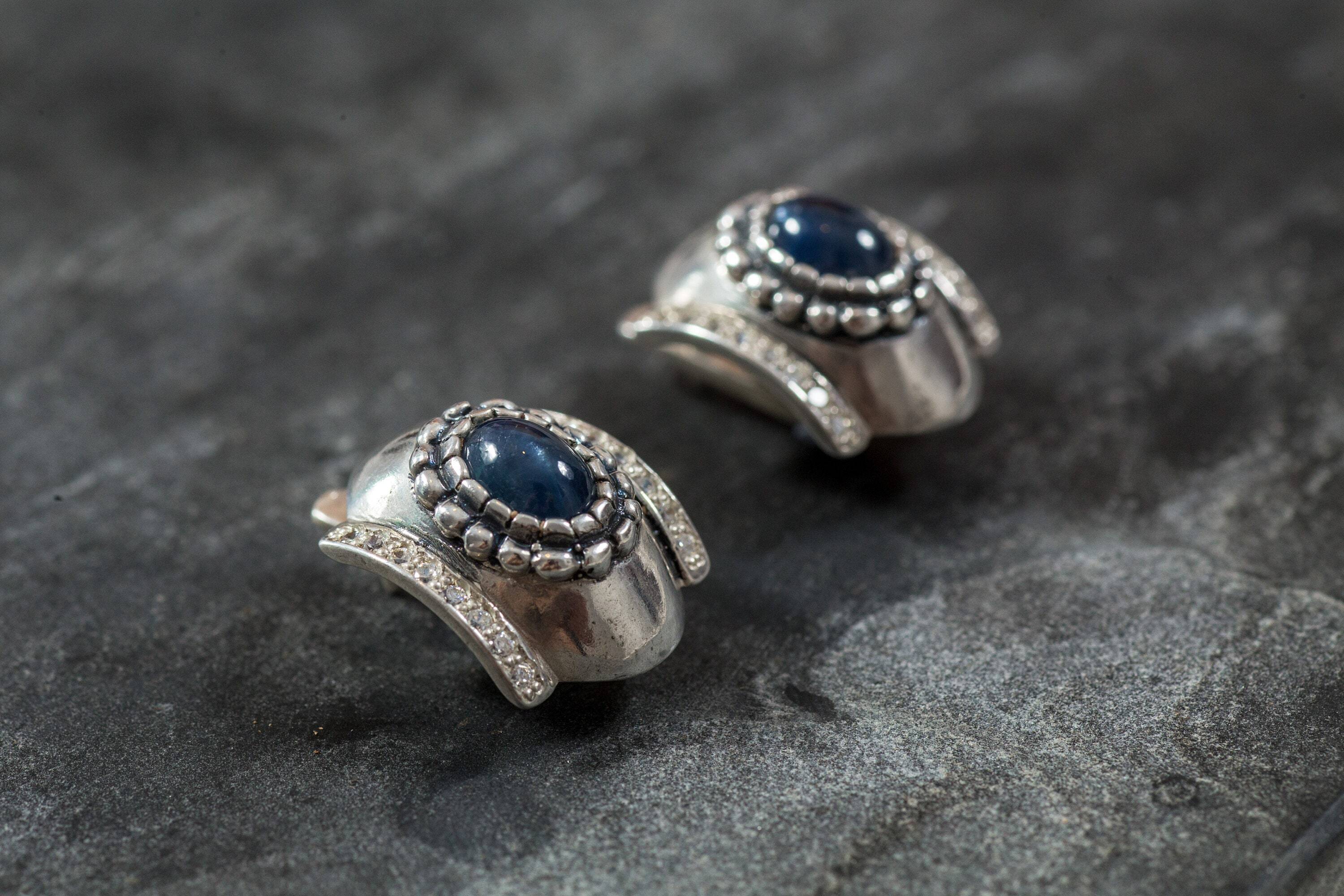 Statement Sapphire Silver Earrings set with Natural Sapphire in a deep blue color, at size 8x6mm each (4 Cts a pair) from Burma with small CZ Diamonds.