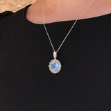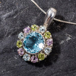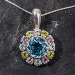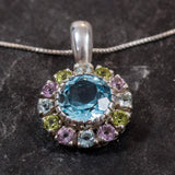 Flower Topaz Pendant set with a Natural Blue Topaz in a perfect diamond cut, flawless clarity & SKY color, at 10mm size (8 Cts). Surrounded by Natural Blue Topaz, Peridot & Amethyst, all Genuine (Brazil) at 3mm each.