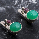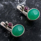 Chrysoprase Statement Earrings set with Natural Chrysoprase in a cabochon cut & natural green color, at size 10x8mm each, together with Natural Ruby at size 3mm each (6 Cts a pair).