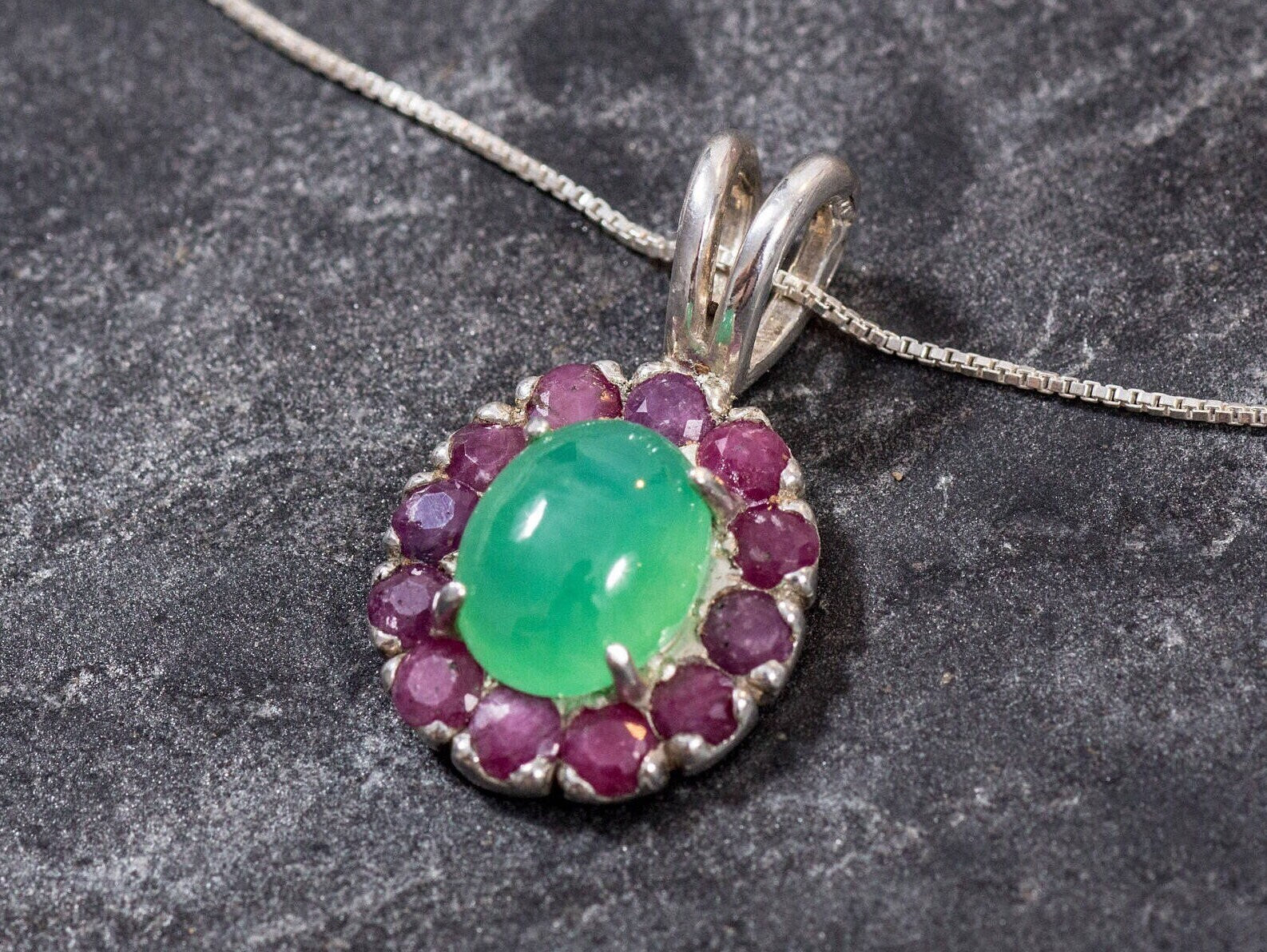 Real 925 silver Chrysoprase necklace surrounded by Natural Ruby gems, handcrafted for style and balance, perfect for gemstone lovers and healing crystal believers.