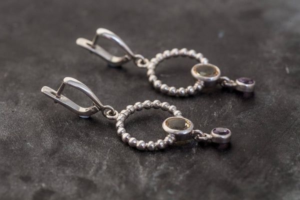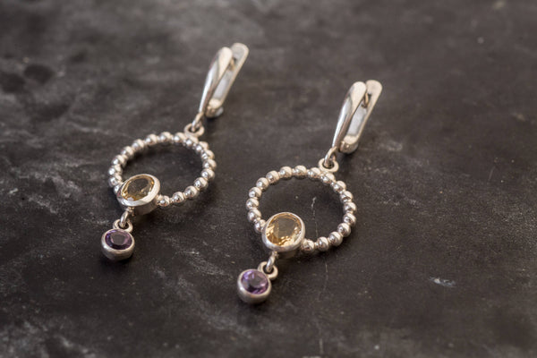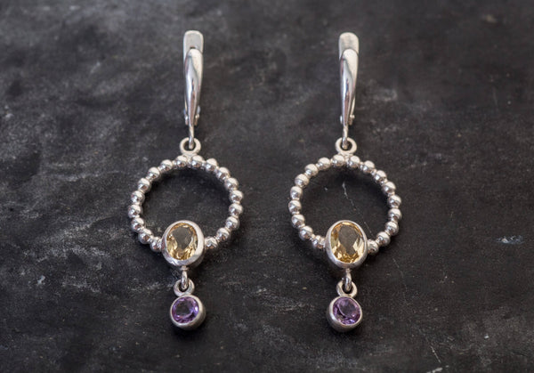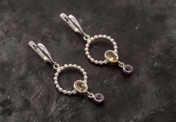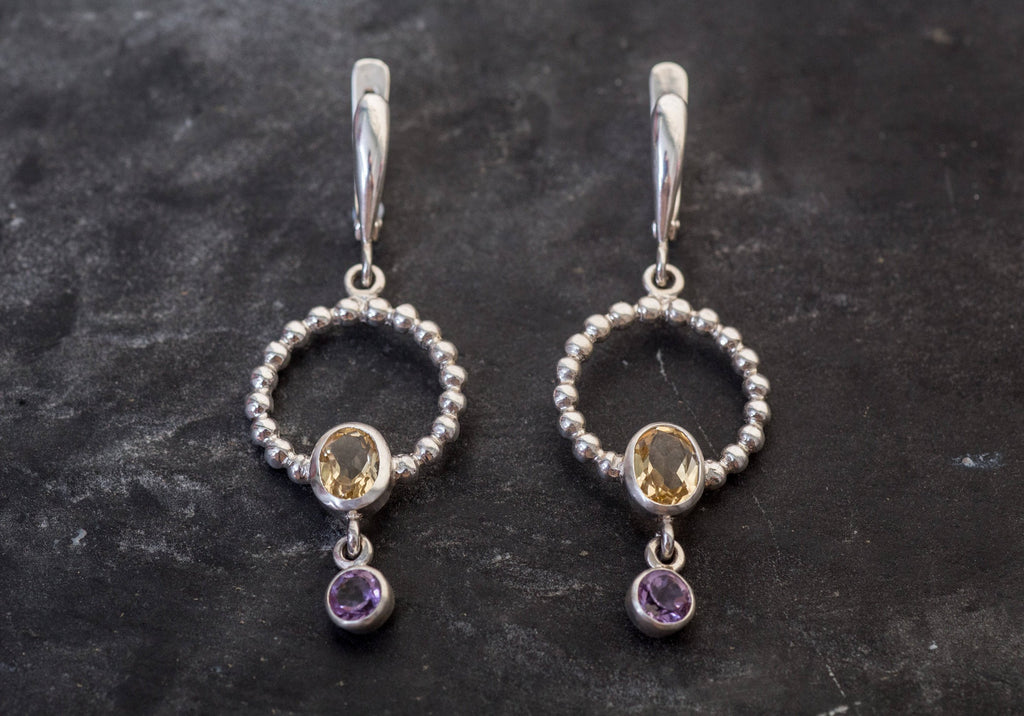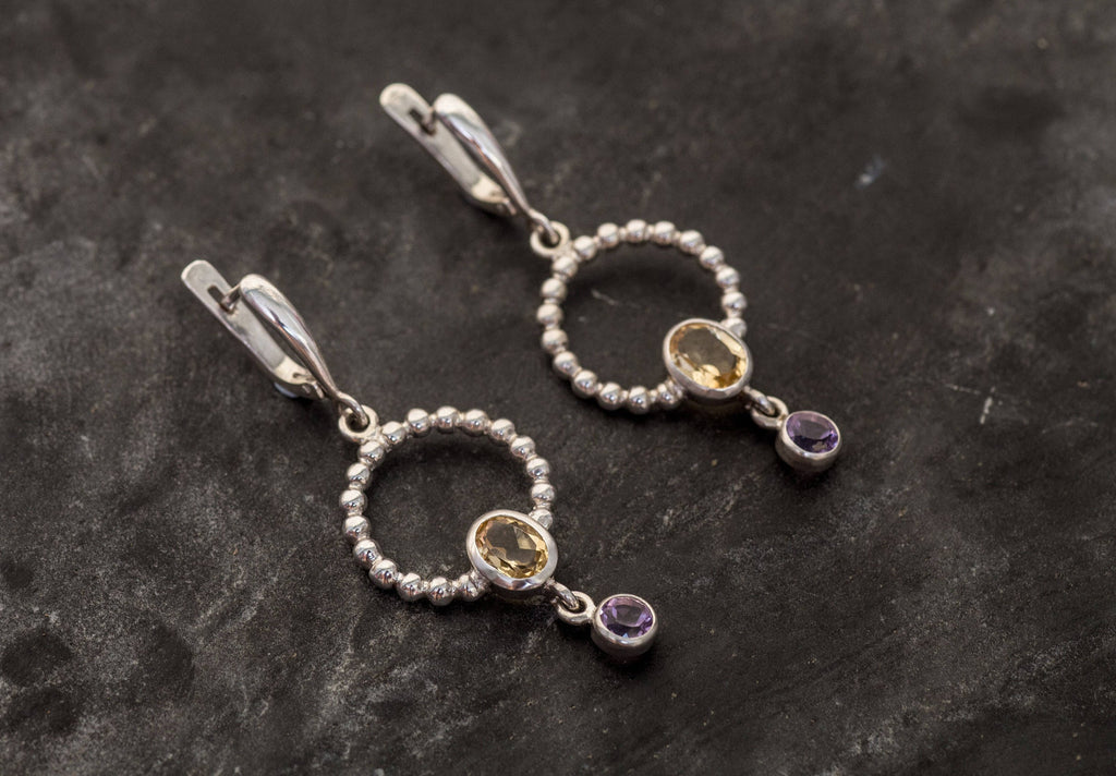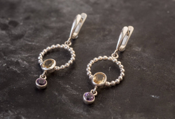 Citrine Earrings, Long Silver Earrings, Amethyst Earrings, Circle Earrings, Natural Citrine, Dangling Earrings, Silver Earrings, November