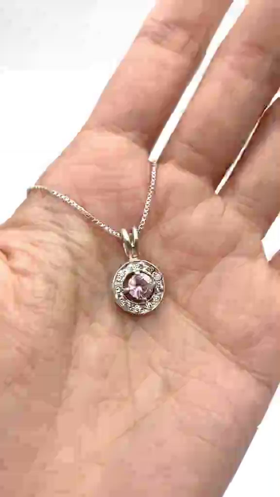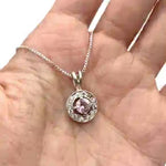 Cluster Morganite Pendant set with a Created Morganite in a perfect diamond cut, flawless clarity & stunning pink color, at 5mm diameter (0.6 Ct) with small CZ Diamond halo.