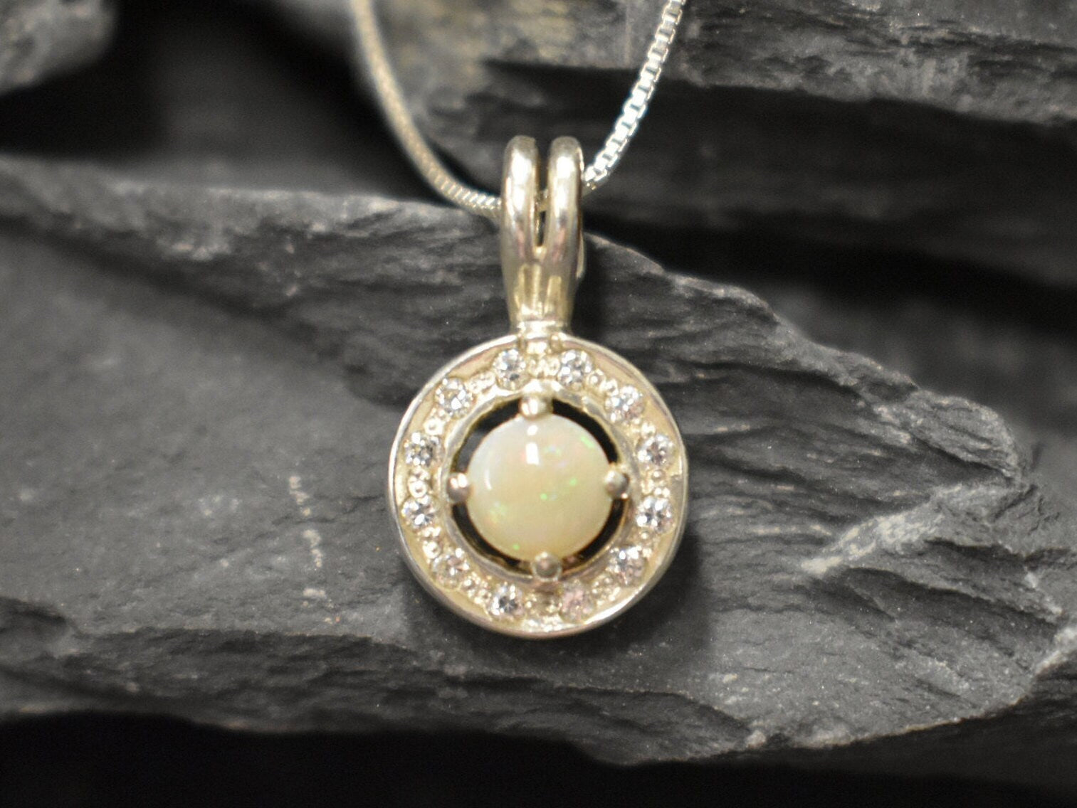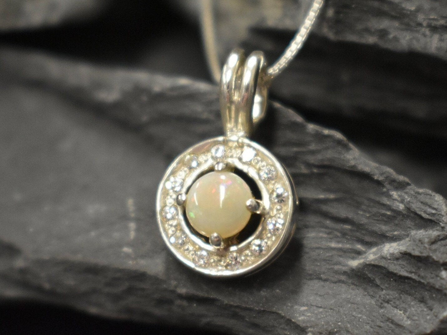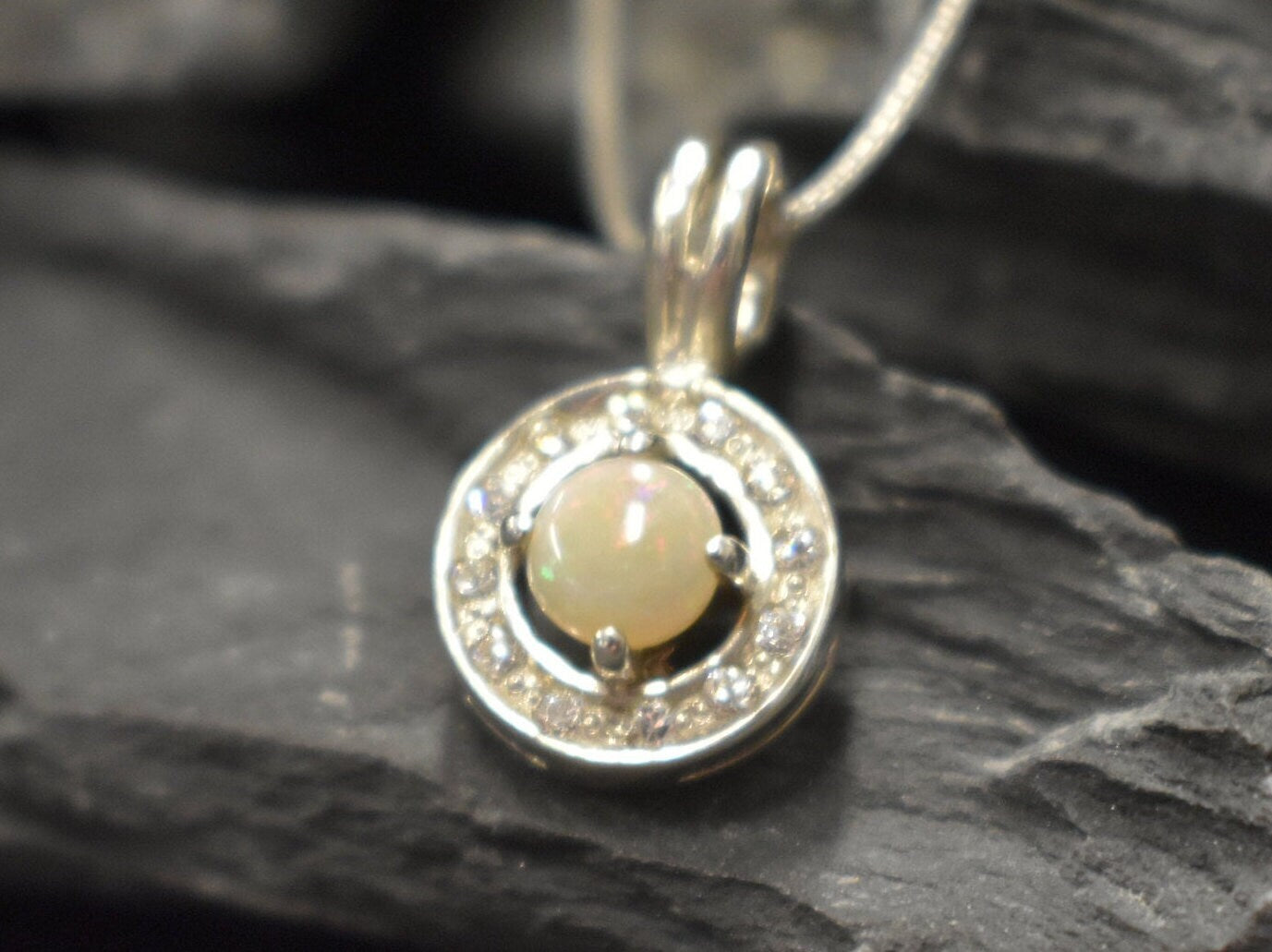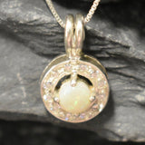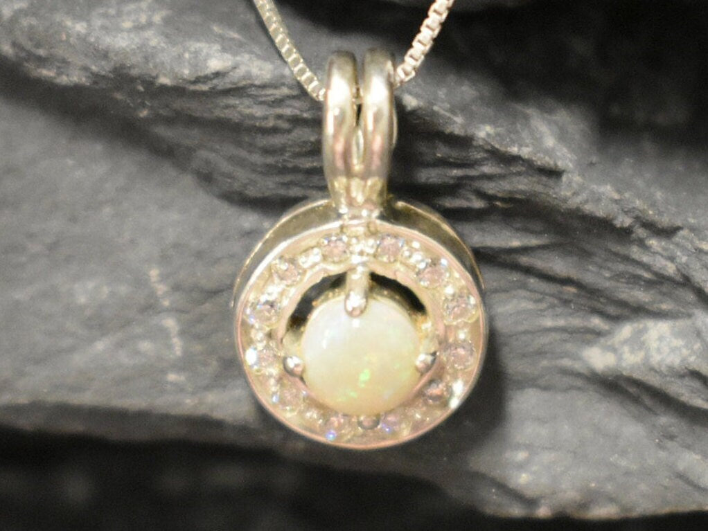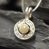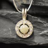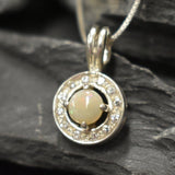 Genuine Opal Pendant set with Natural Australian Opal in a high grade with a play of natural colors, at 5mm (0.6 Ct) with small CZ Diamonds around.
