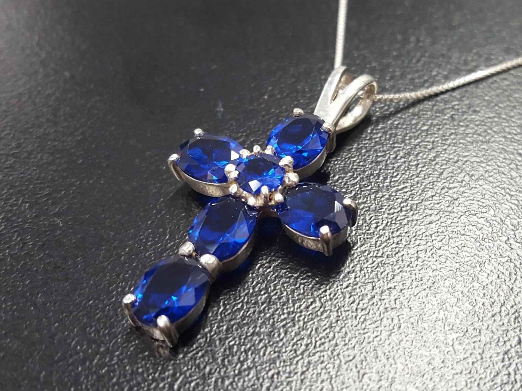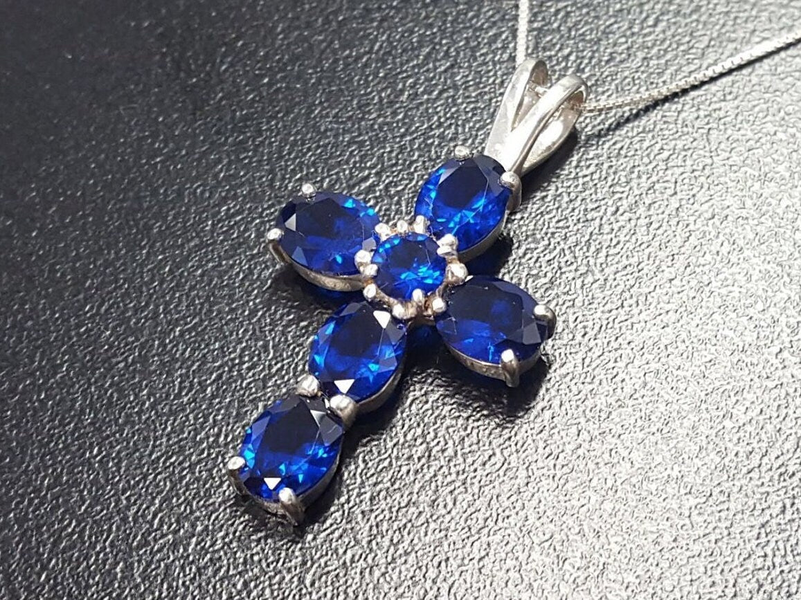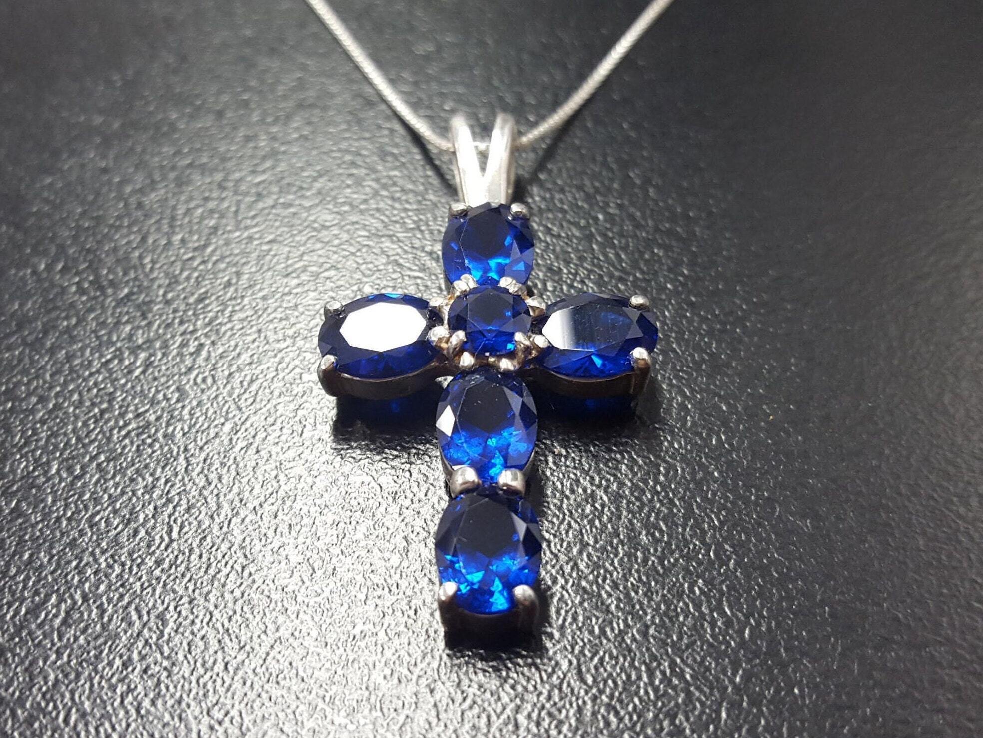 Cross Pendant, Sapphire Pendant, Created Sapphire, Symbolic Pendant, Blue Cross Pendant, Christian Pendant, Blue Pendant, 925 Silver Pendant