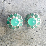 Emerald Earrings set with Natural Emerald halo at 3mm each, Natural Chrysoprase in centre at 8mm diameter, sourced from Australia.