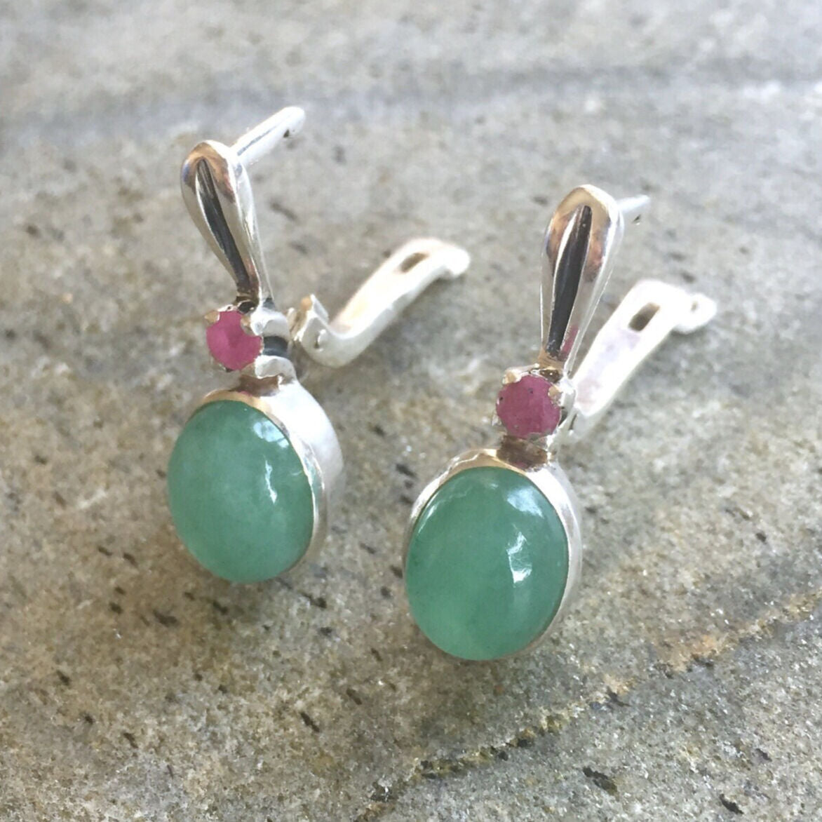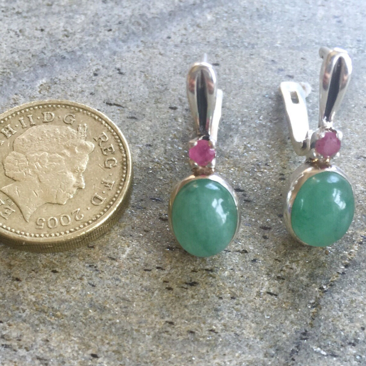 Emerald Drop Earrings set with Natural Emerald in a cabochon cut & natural green color, at size 10x8mm each together with Natural Ruby at size 3mm each (6 Cts a pair).