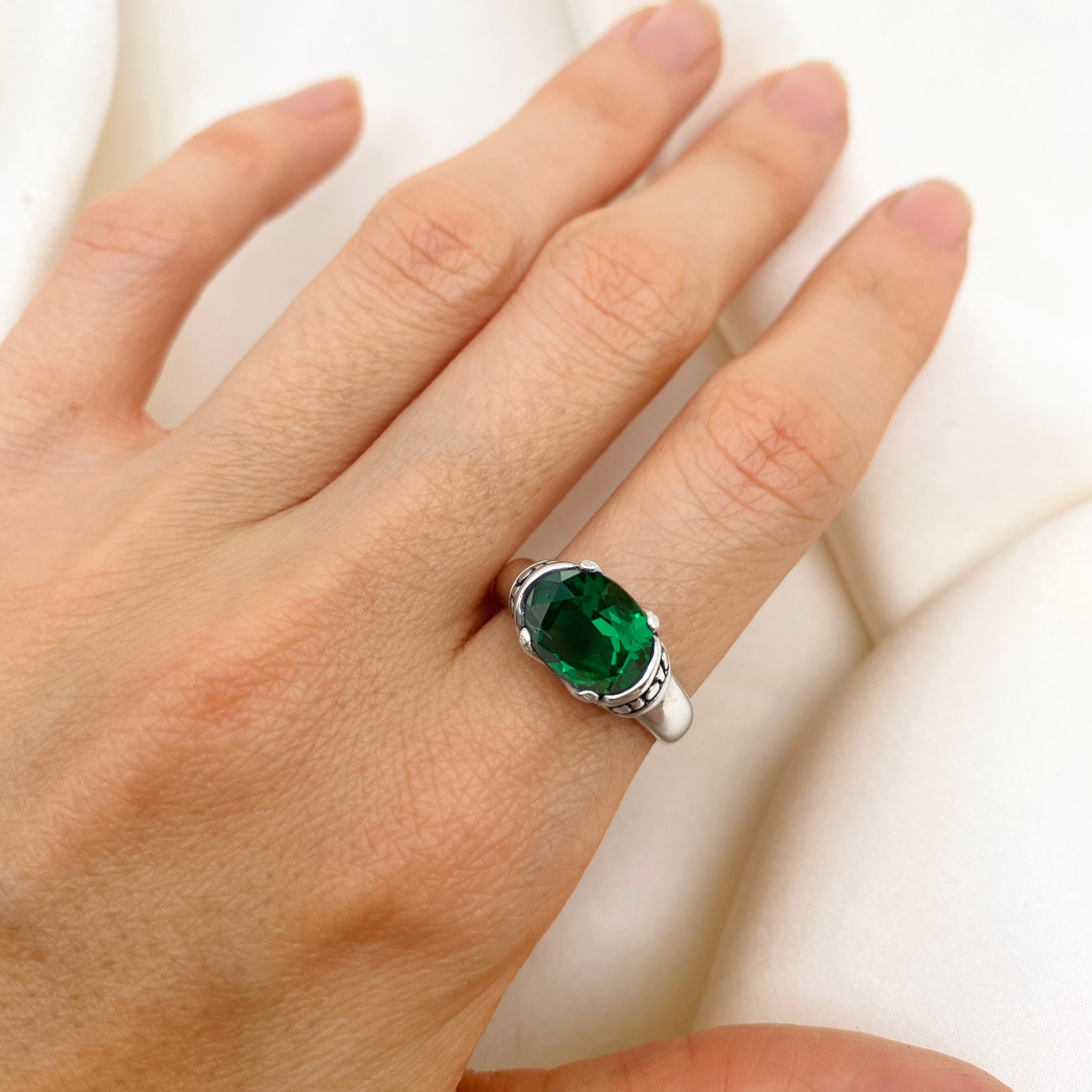 Created Emerald Ring made in 925 Sterling Silver with Oval Created Green Emerald in Solitaire setting, May Birthstone gift idea, symbolizes, ideal for everyday wear and perfect for birthday gifting and special occasions.