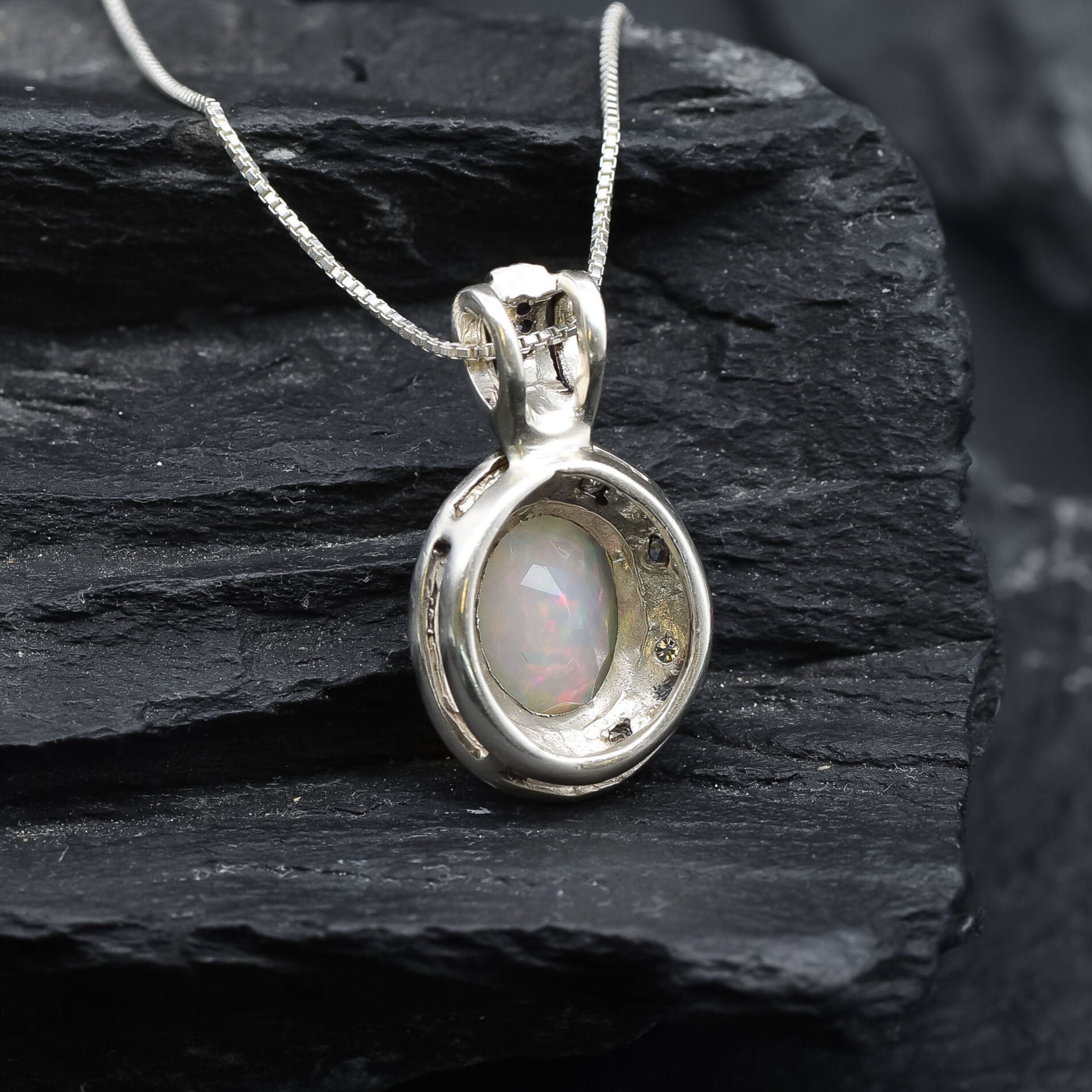 Opal Pendant set with Natural Ethiopian Opal - Fire Opal - diamond cut & stunning bright flashes of fire color, at 10x8mm size, 3 Carats, with small CZ Diamonds.