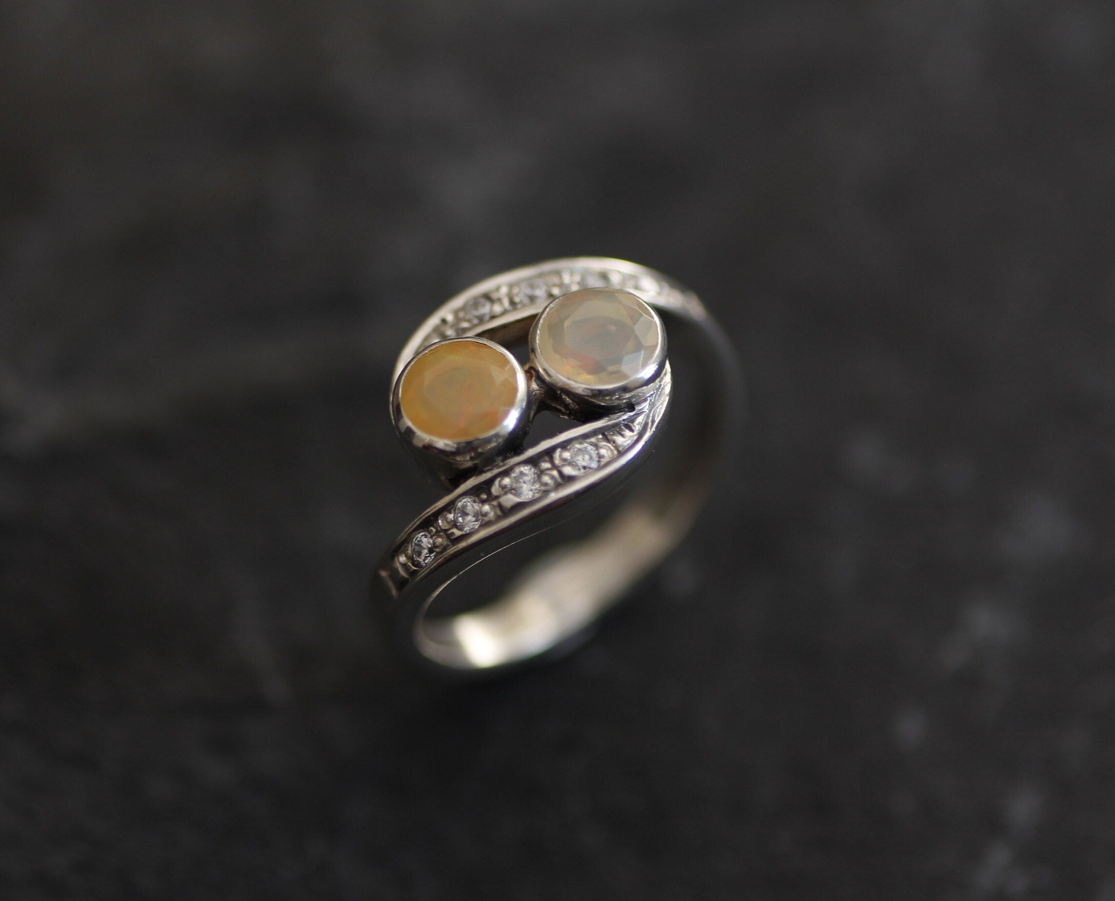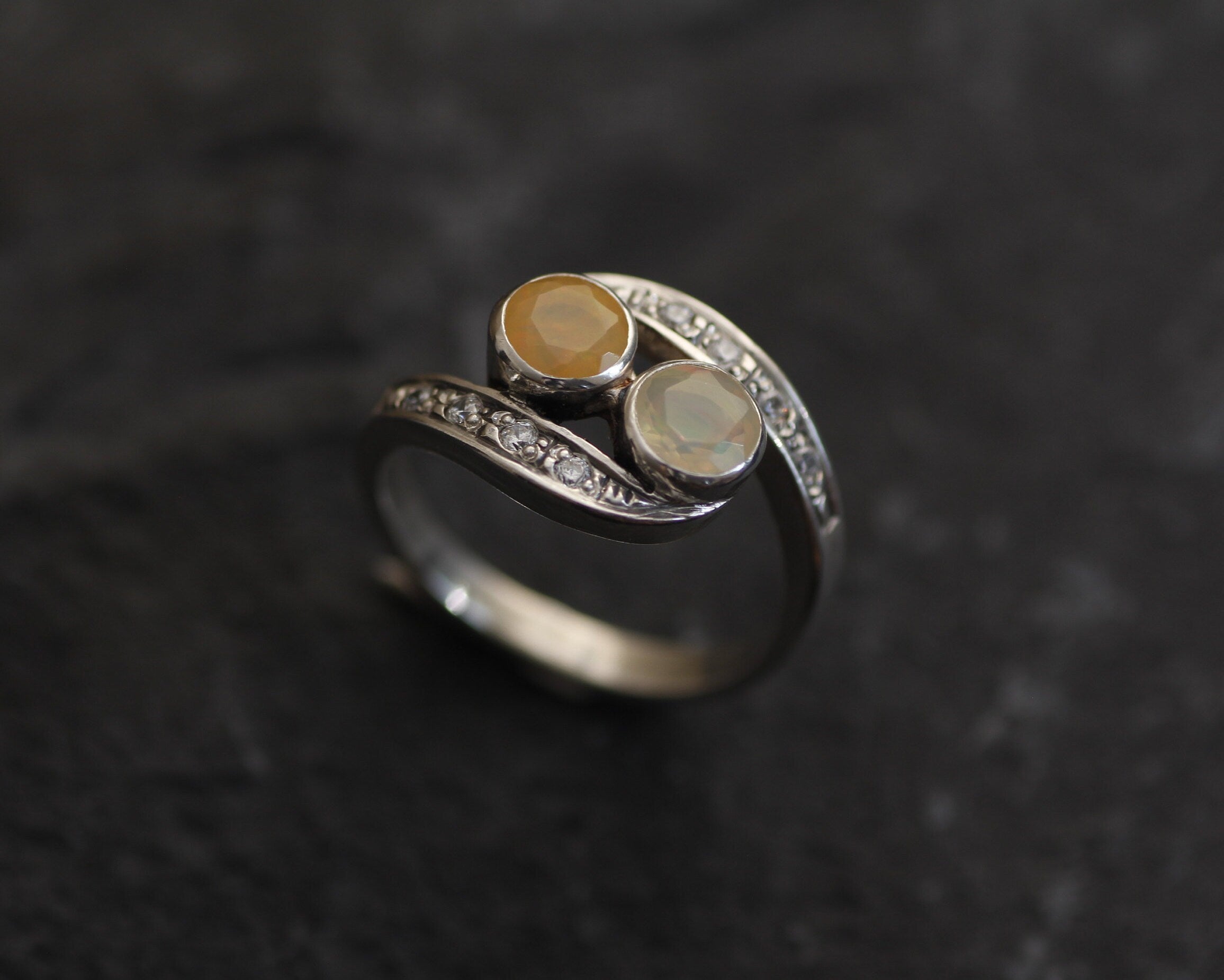 Fire Opal Ring - Diamond Bypass Ring - Two Stone Ring