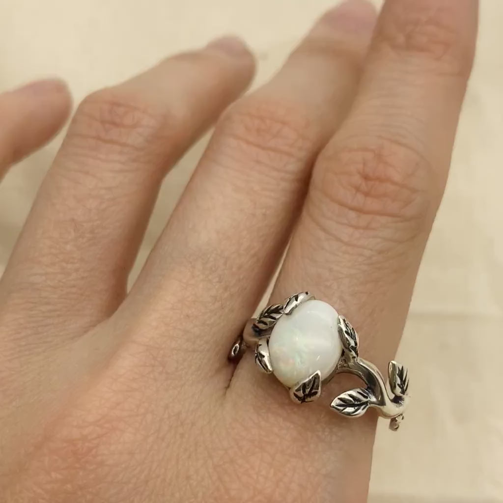 White Opal cabochon vine and leaf ring crafted in solid 925 sterling silver, featuring a nature-inspired design with flashes of fire colors. The durable vine-style band offers elegance and uniqueness while remaining comfortable for daily wear. As the October Birthstone, White Opal makes a thoughtful gift for birthdays, anniversaries, and nature lovers. Perfect to wear at weddings, outdoor celebrations, and festive gatherings.